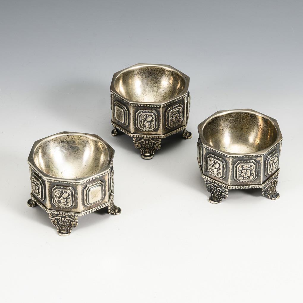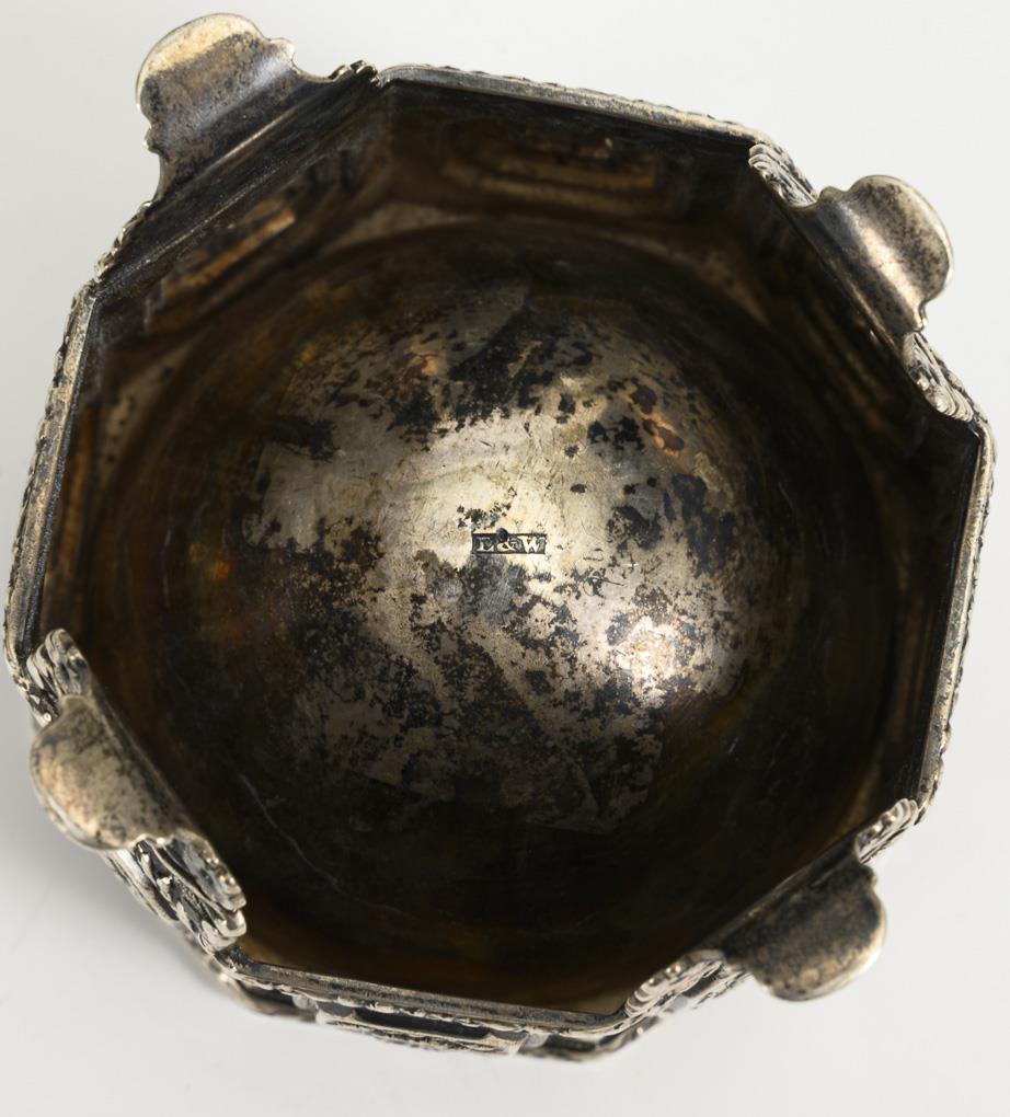 8-eckige Form mit reliefierten Blütenmedaillons. Gebrauchsspuren, 2 Füßchen repariert.