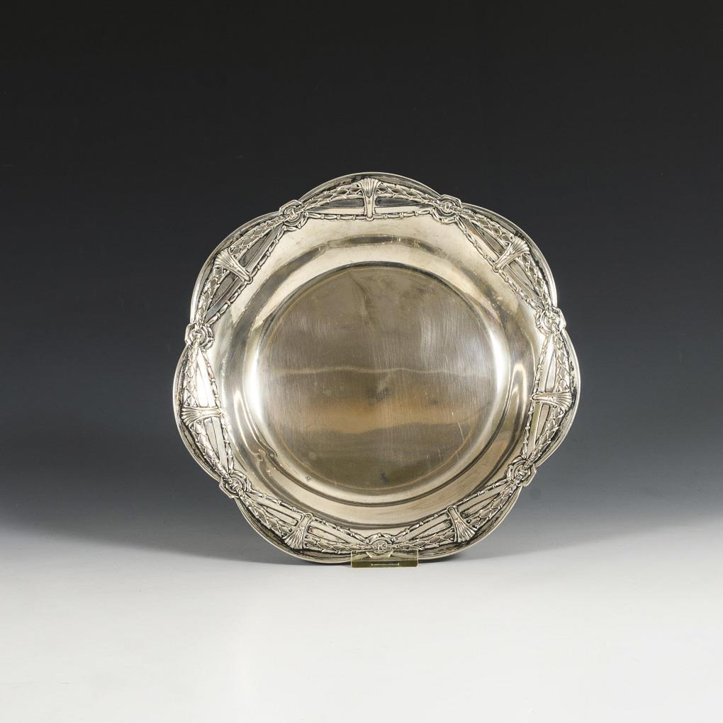 Runde neoklassizistische Schale mit reliefiertem Rand. 2 Dellen.