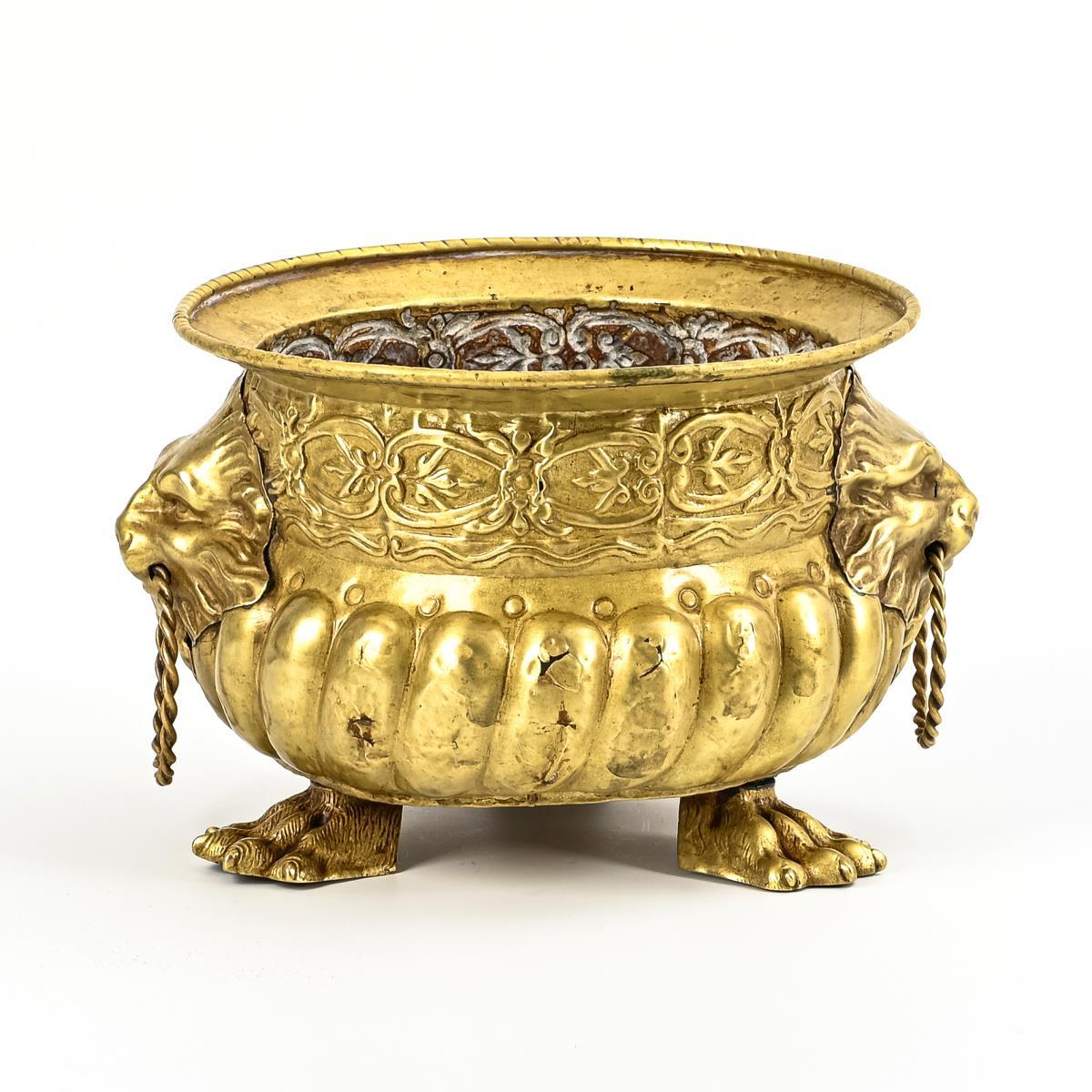 Messingblech wohl geprägt, Füße Messingguss. H 17 cm, Ø 22 (ohne Griffe).