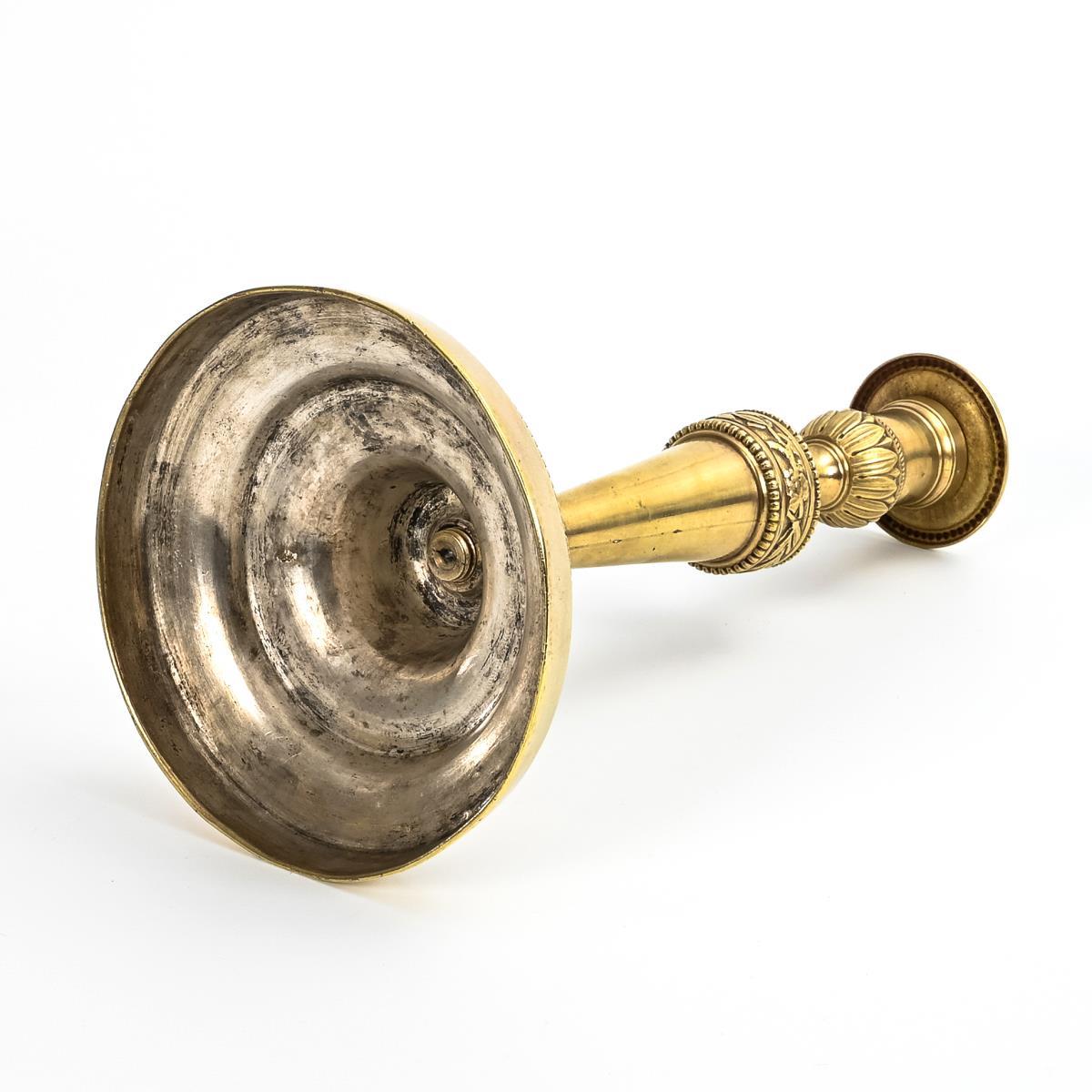 Spätbarocker Bronzeleuchter mit Relieffries aus Wein und Lorbeer am Rundfuß, konischem Schaft mit gleichem Schulterfries sowie schlanke Vasentülle mit Lanzettblättern und Einsteck-Wachsteller. Minimale Alters-/Gebrauchsspuren.