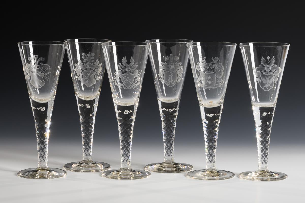 6 große Kelchgläser mit Adelswappen. Josephinenhütte.