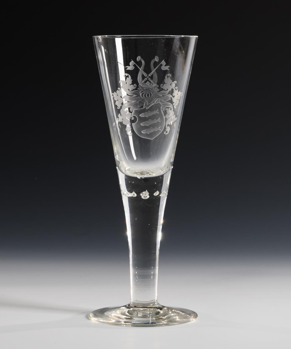 Konische, in den massiven Schaft übergehende Kuppa mit eingestochenem Luftblasenkranz am Boden, Rundfuß. Schauseitig das gravierte Wappen derer von Seidlitz, auf dem Fuß die Widmung "C. G. v. Seidlitz-Ludwigsdorf (...) s./l. A. v. d. Gabelentz (...) z. fr. Erg. S. 18 R. 94 S.". Unterseitig Leim(?)-/Lackspuren.