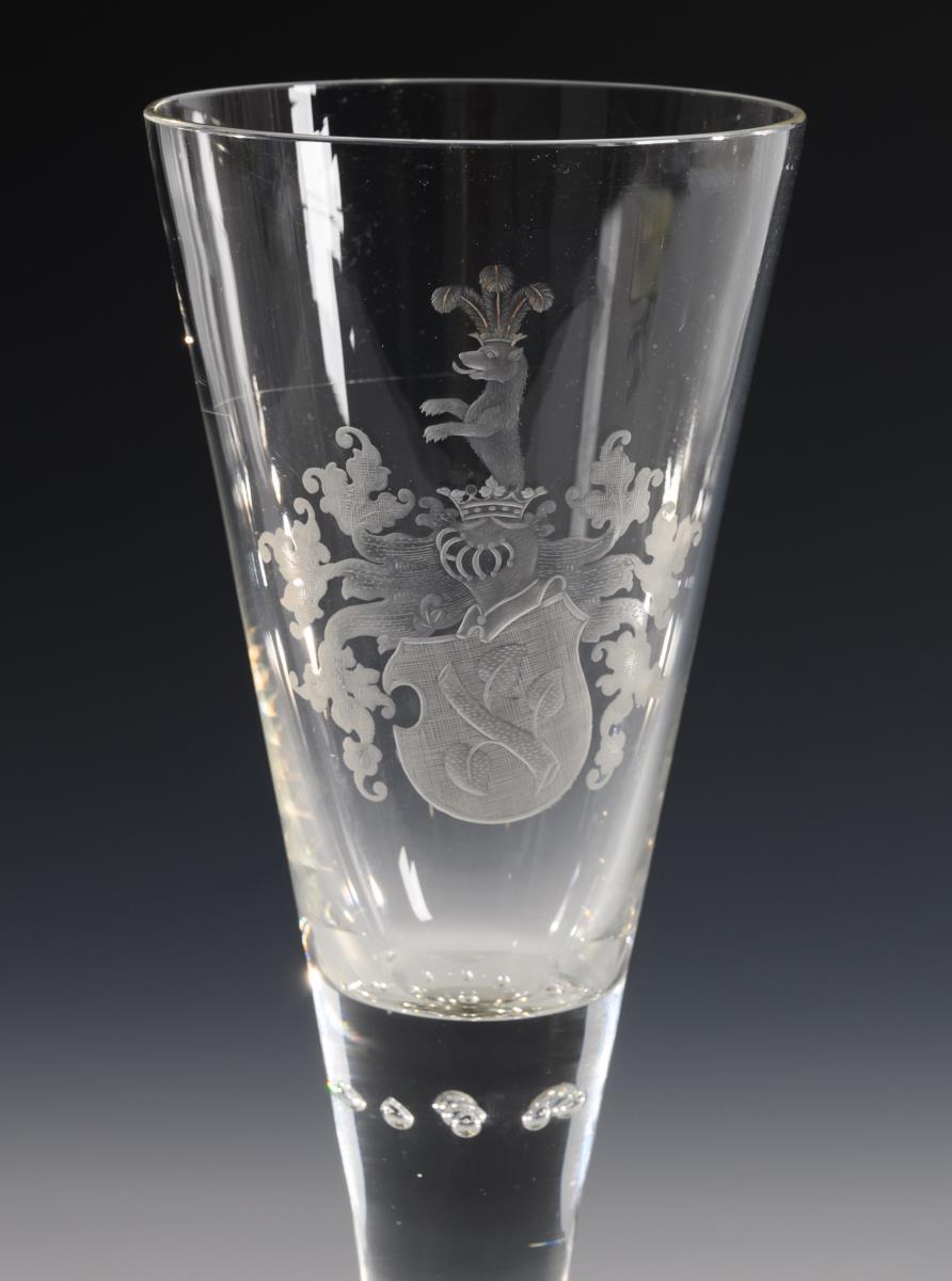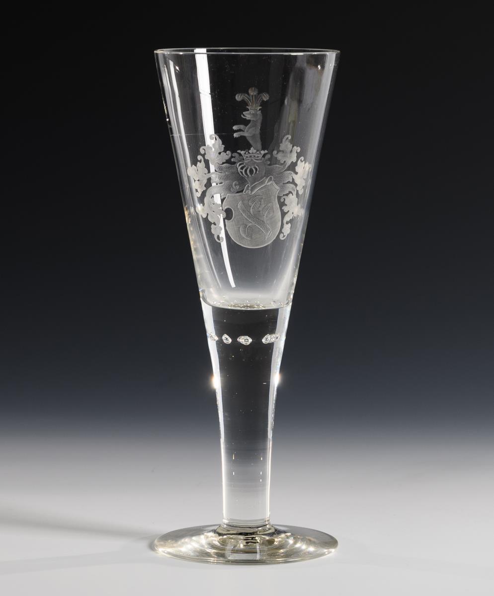 Konische, in den massiven Schaft übergehende Kuppa mit einem eingestochenen Luftblasenkranz am Boden. Schauseitig das gravierte Wappen derer von Werthern, auf dem Fuß die Widmung "H. Th. Frh. v. Werthern (...) s/l. A. v. d. Gabelentz (...) z. fr. Erg. S. 18 R 94 S.". Unterseitig Leim(?)spuren und Kratzer.