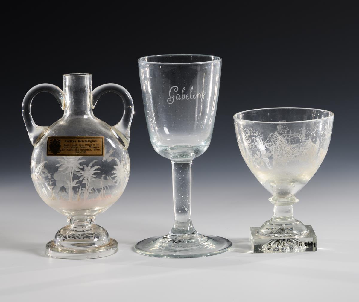 1x Weinglas mit der gravierten Bezeichnung "Gabelentz" auf der Kuppa (H 18,5 cm). / 1x Pokal mit bauchiger Kuppa, Schaft und quadratischem Fuß; auf der Kuppa das nadelgravierte Motiv eines Mannes und eines Löwen sowie einer Aufschrift und der Datierung "God Jul 1898" (H 13 cm). / 1x Plattflasche mit zwei Henkeln und Rundfuß, beidseitig die gravierte Darstellung einer Waldlandschaft mit Jäger und Wildschwein, verso ein Etikett mit der Aufschrift "Antikes Kristallglas. Kopie nach dem Original im kais. königl. österr. Museum für Kunst und Industrie, Wien. 1650-1750" (H 17 cm). Mündungsrand der Flasche bestoßen.
