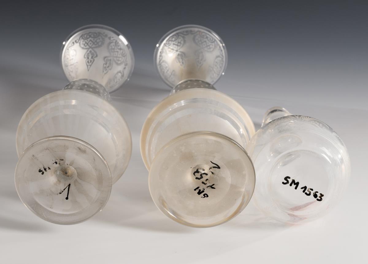 2 Fußvasen mit Glockenkorpus, Kraterhals und ornamentalem Ätzdekor (H 30 cm). / 1 Karaffe mit Kugelkorpus, Enghals, Hohlstopfen und floralem Ätzdekor (H 22 cm).