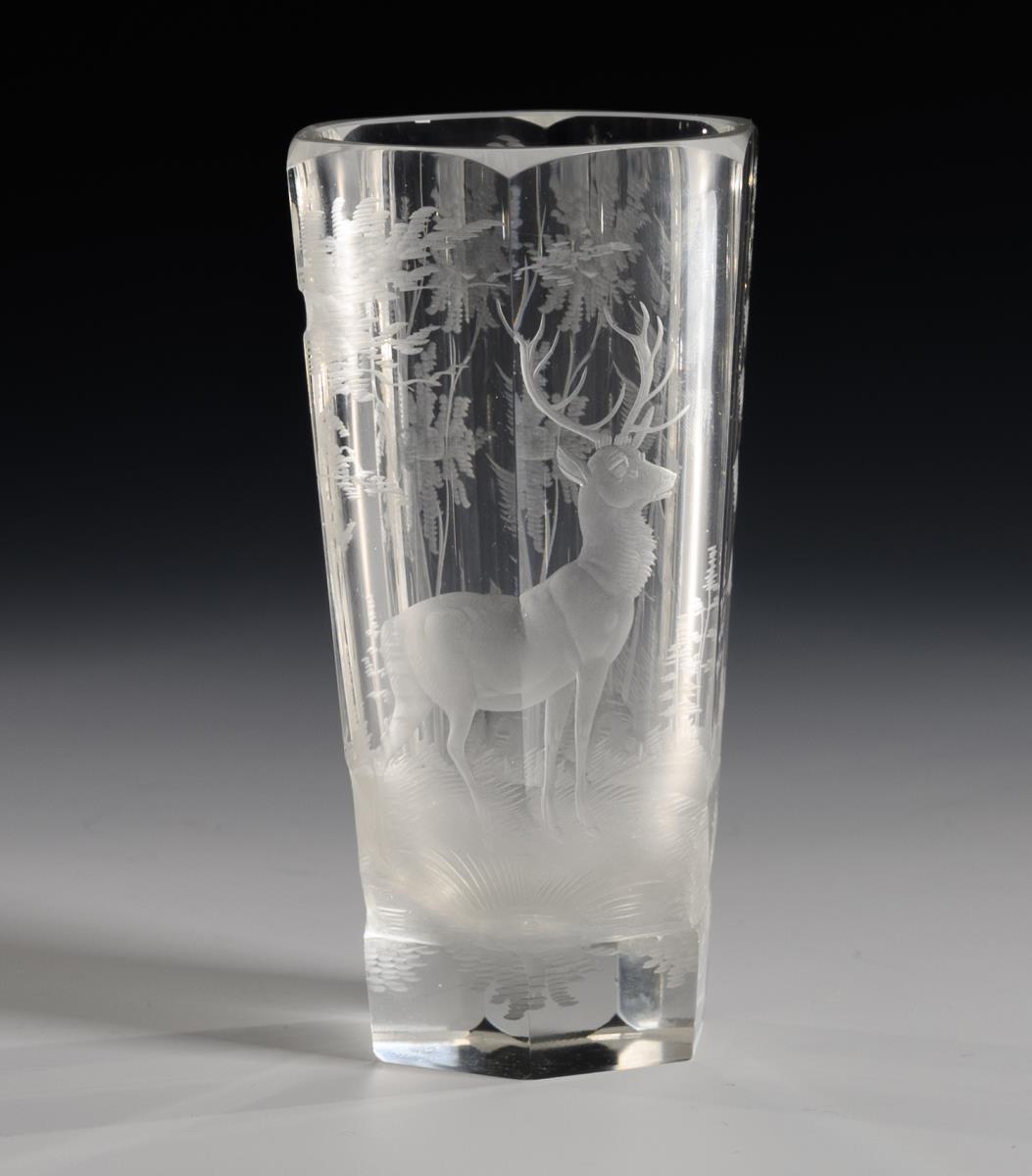 1x Jagdpokal: Glockenkuppa, gedrehter Schaft und Rundfuß, auf der Kuppa eine geschnittene, vergoldete Darstellung einer Waldlandschaft mit springendem Rehbock (H 24 cm). / 1x Kratervase aus farblosem Glas mit schwarzlotgemalter Landschaftsmalerei (H 20 cm). / 1x sechsfach facettierter kleiner Becher mit der geschnittenen Darstellung einer Waldlandschaft mit Hirsch (H 11,5 cm). Chip am Vasenrand.