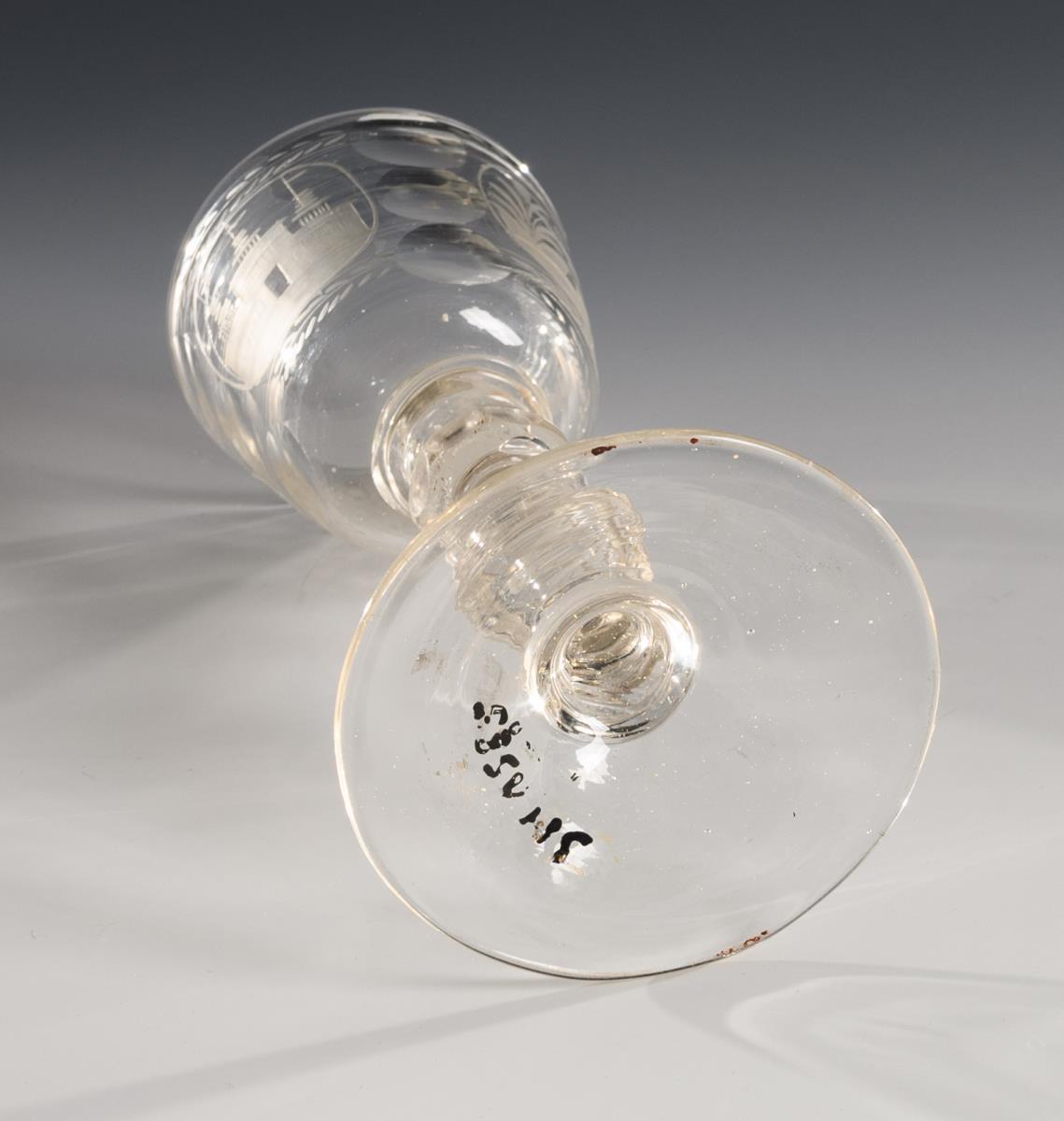 Konische Kuppa, mehrfach gegliederter Schaft mit wabenfacettiertem Nodus, Rundfuß; Abriss. Auf der Kuppa drei Medaillons mit gravierten Motiven (Architektur, Herz, Vogel).