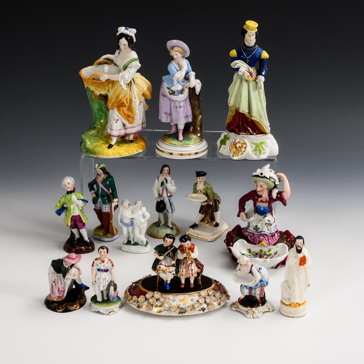 Verschiedene Figuren (u.a. Gärtnerin mit Korb, Dame beim Kirchgang, Evangelist Markus, Kinderfiguren, Jäger, Chinese) sowie 1 Dosendeckel mit Kinderpaar. Brandriss im Sockel der Gärtnerin mit Korb, Blütenbelag des Deckel partiell sowie Hutfeder des Jägers bestoßen, Daumen eines Knaben fehlt.