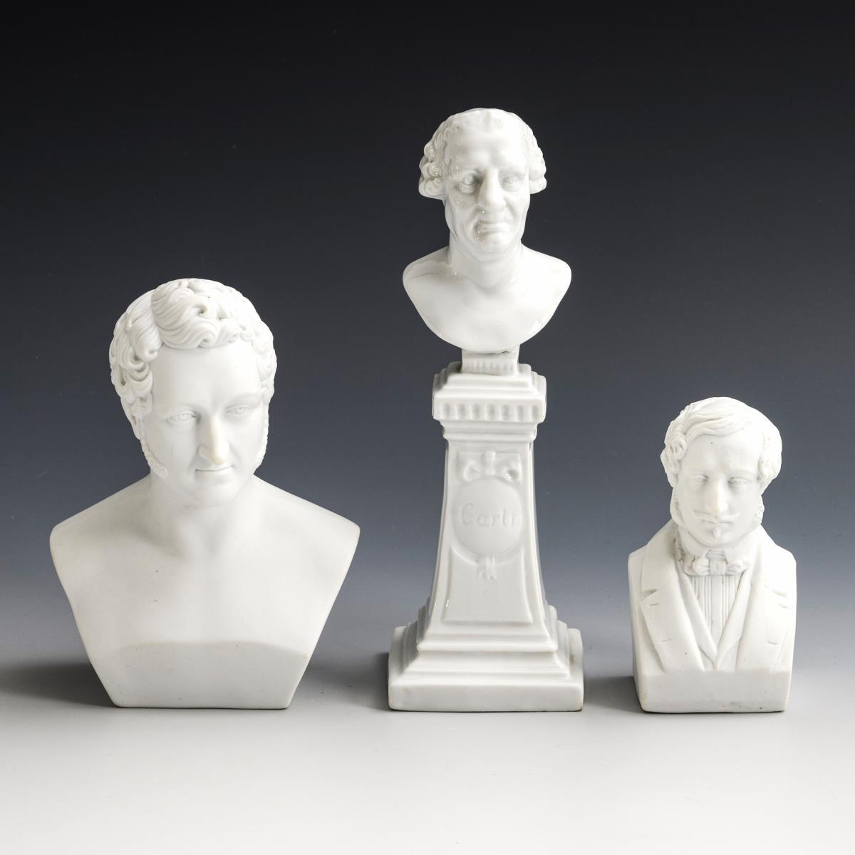 2 Biskuitbüsten, davon 1x bezeichnet "Thalberg"(H 12 und 16 cm). / 1 Fürstenberg: Seltene, glasierte Büste auf hohem Postament, bezeichnet "Carl I." (= Herzog Carl I. von Braunschweig-Lüneburg [1713-1780]; H 22 cm). 1x verso Brandriss im Sockel.