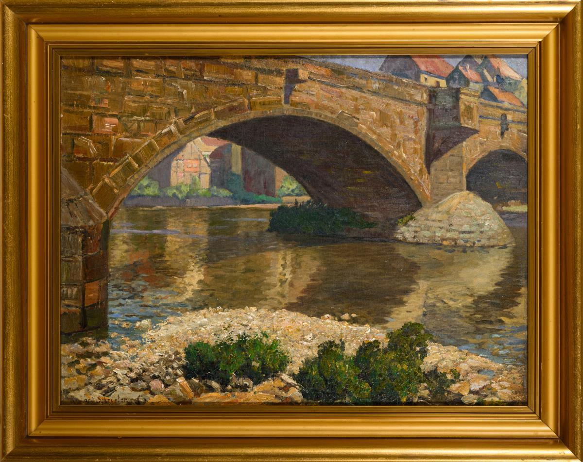 Ruhiger Flusslauf unter steinerner Bogenbrücke und dahinter sichtbaren Altstadthäusern im Sonnenschein. Leichte Altersspuren.