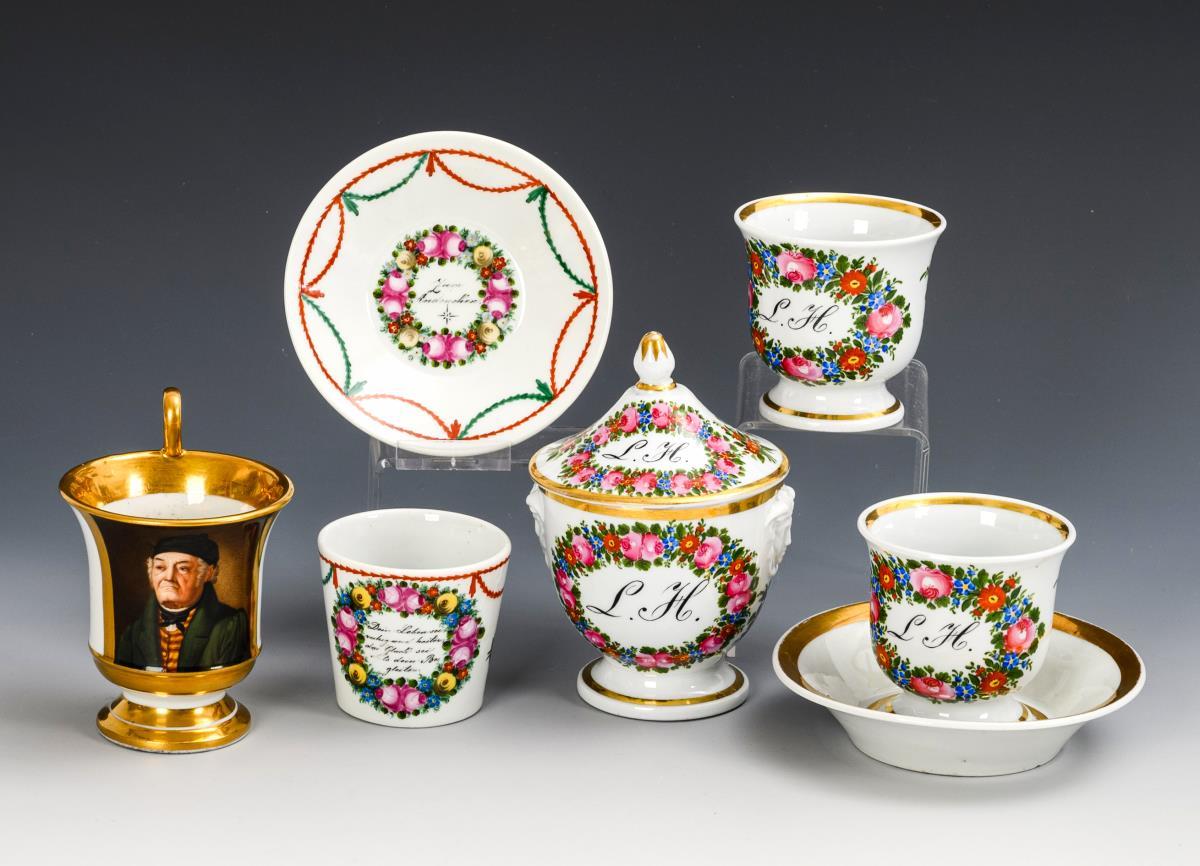 Zuckerdose (H 13,5 cm) mit Medusenhaupthandhaben und 2 gefußte Glockentassen (H 7,5 cm): bemalt mit dem Monogramm "L.H." in einem Blütenkranz. / Konische Tasse mit gewinkeltem Henkel, je in einem Blütenkranz der Spruch "Dein Leben sei ruhig und heiter, das Glück sei stets dein Begleiter" (Tasse) und "Zum Andenken" (Untertasse) (H Tasse 6 cm, Ø Untertasse 12 cm). / Gefußte Glockentasse mit Palmettenhenkel und dem schauseitigen Porträt eines alten Mannes (H Tasse 11 cm, Ø wohl originale Untertasse 13 cm). 1 Monogrammtasse mit Haarriss im Henkel, Porträttasse mit Wandungshaarriss, Haarrissspinne in der Untertasse der Spruchtasse.