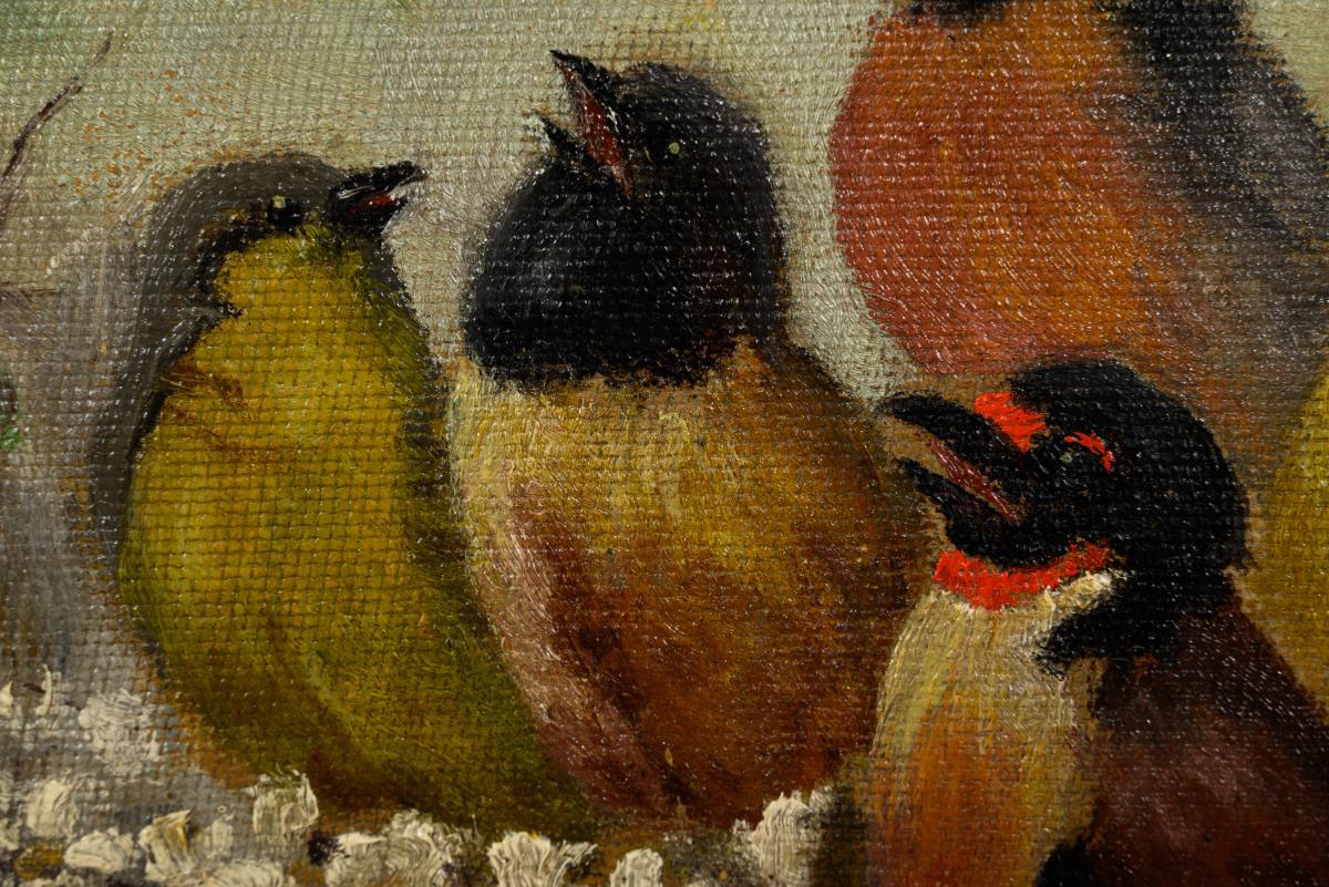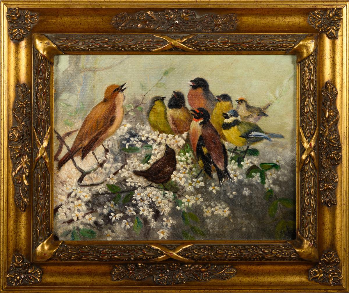 Die Vögel auf den blühenden Zweigen des Baumes im hellen Licht. Minimale Altersspuren.