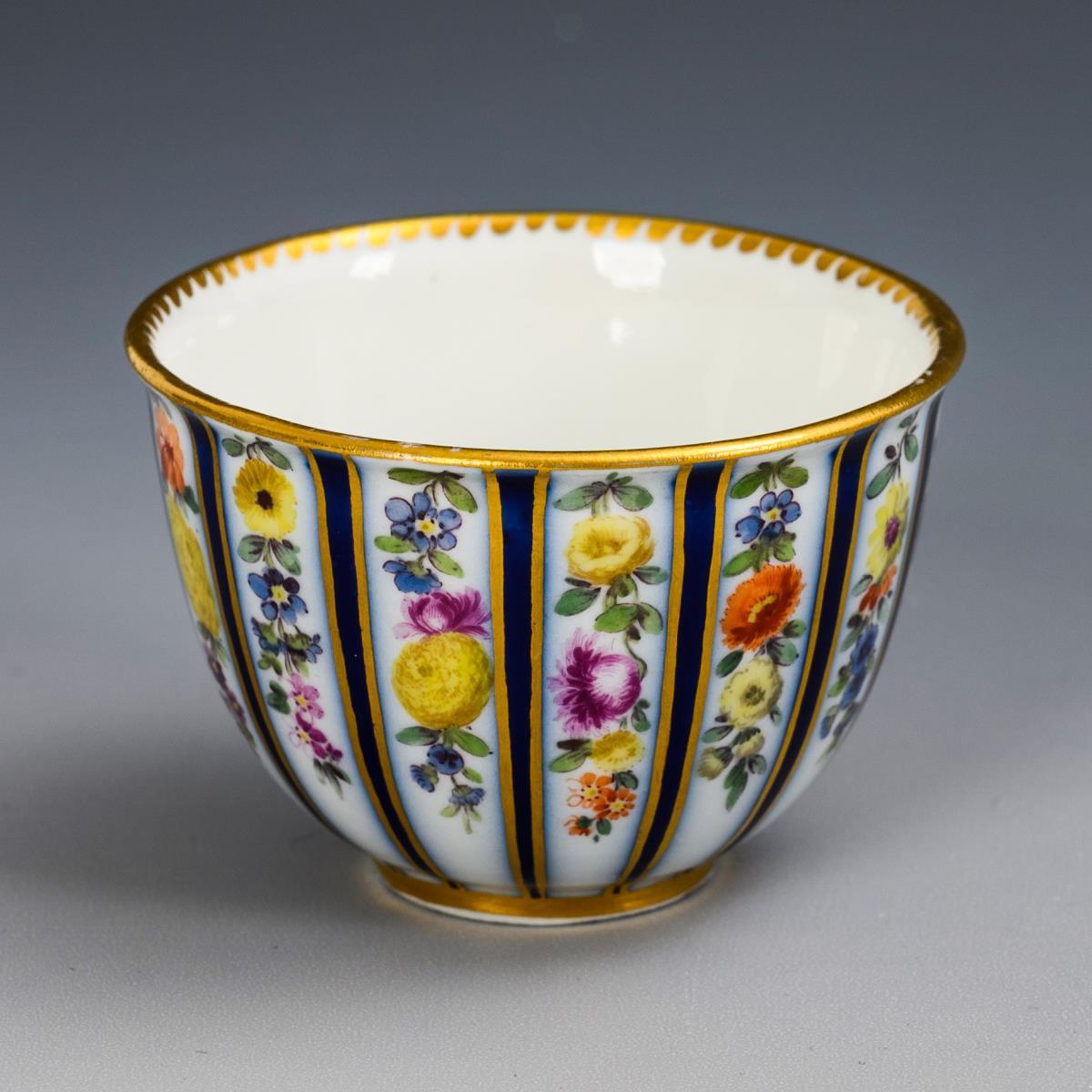 Zwischen kobaltblauen Streifen polychrom gemalte Blumenfestons, goldstaffiert.