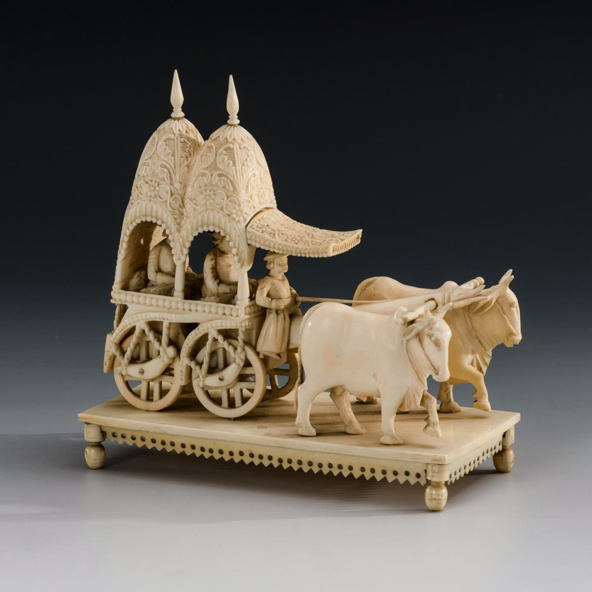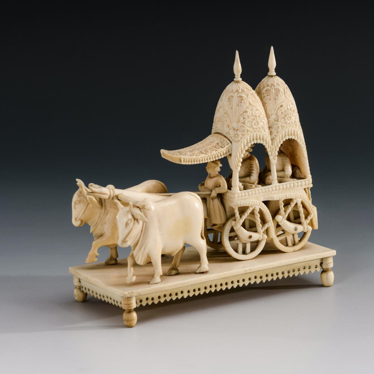 Vierrädriger Karren mit zwei Figuren unter Baldachinen. Auf flachem Sockel. Fein geschnitztes Reliefmuster.