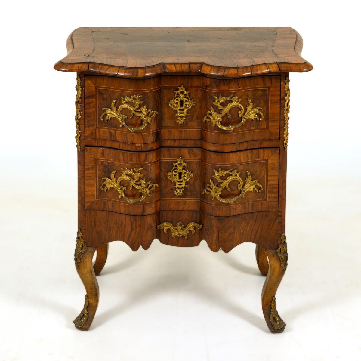 Kleine 2-schübige Kommode in stiltypisch geschwungener Form auf 4 geschweiften Beinen; verziert mit üppigen Bronzebeschlägen und gespiegeltem Maserfurnier. Alters-/Gebrauchsspuren, Furnier mit kleinen Defekten.