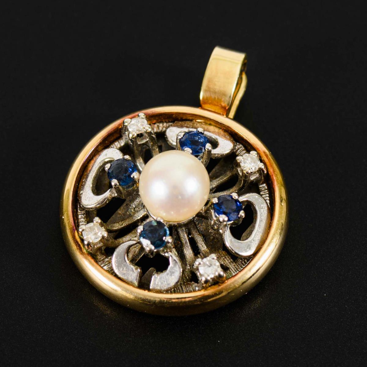 Zuchtperle, 4 chatongefasste Saphire und 4 Diamanten, in Zargenfassung mit Klippöse. Ehemalige Kettenschließe, in solider Zarge gefasst.