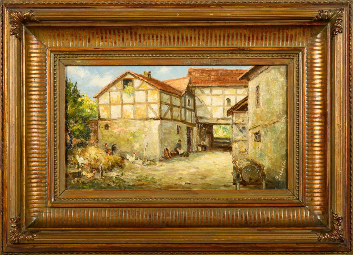 Dreiseitenhof mit Geflügel auf dem Misthaufen und dem Bauernpaar nahe dem Eingang.