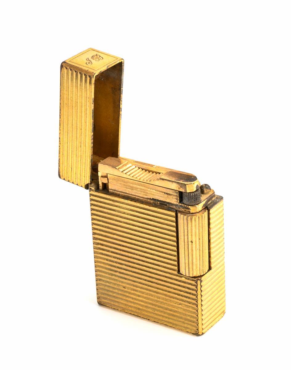 Modell Linie I, kleine Ausführung. Allseits geriffeltes massives Gehäuse mit geriffeltem Reibrad und Scharnierdeckel; auf dessen Stirnseite graviertes Monogramm "JB". Funktioniert. Alters-/Gebrauchsspuren.