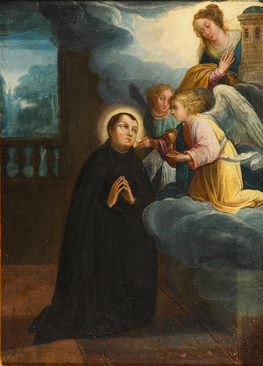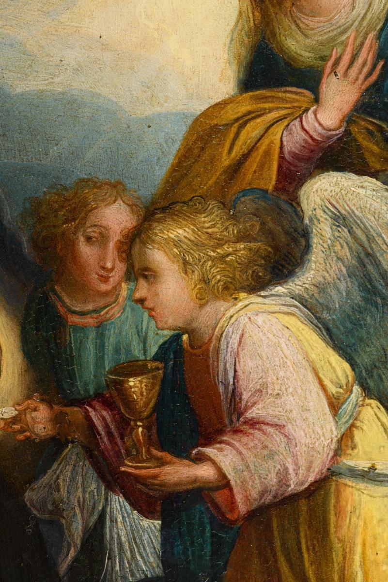 Der betende Heilige auf Knien bekommt das heilige Sakrament des letzten Abendmahls von Engeln gereicht.