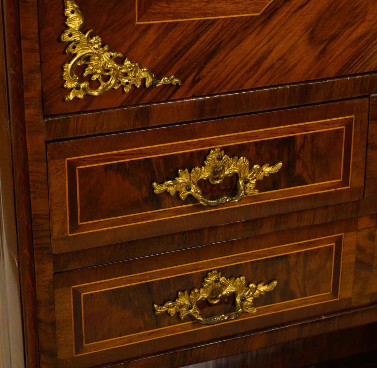 Elegante Aufsatzkommode in stiltypisch geschwungener Form, mit 2-schübigem Kommodenunterteil auf 4 geschweiften Beinen und ergänztem, 1-türigem Aufsatz mit gesprengtem Giebel und verspiegelter Front, 4 kleinen Schüben und offener Ablage; reich verziert mit üppigen Bronzebeschlägen; innen 2 Einlegeböden. Alters-/Gebrauchsspuren, Aufsatz ergänzt,.