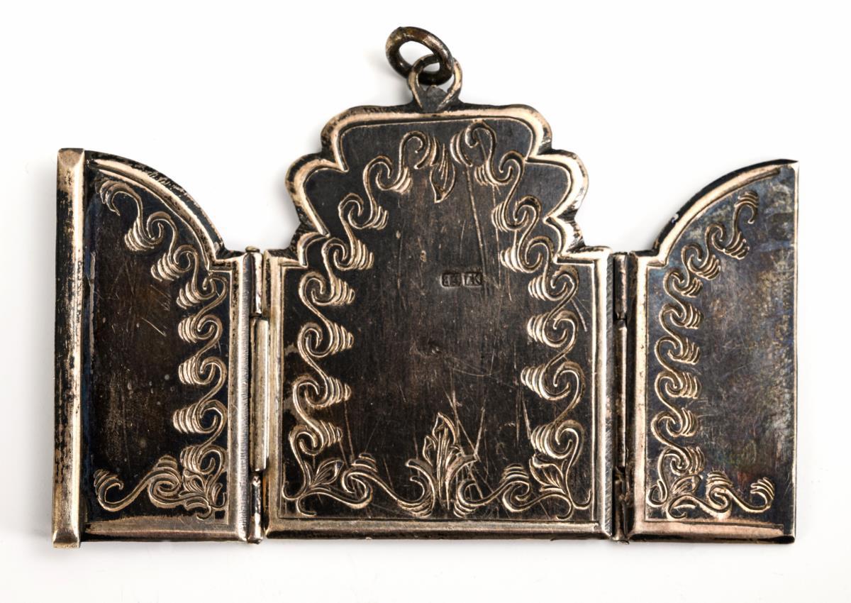 Je als Anhänger ausgeführter Klappaltar in der Art einer Reiseikone. Deesis mit Christus Pantokrator zwischen Johannes dem Täufer und der Gottesmutter. / Madonna zwischen 2 Engeln. / Marientod mit flankierenden Heiligen.
