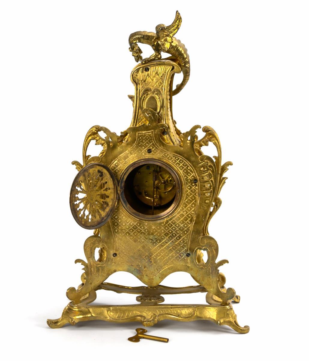 Teils durchbrochen gestaltetes Gehäuse mit bekrönendem Drachen, reichem Blattwerk und Rocaillen. Dazu 2 passende 5-flammige Leuchter. Leichte Alters- und Gebrauchsspuren, Glocke fehlt, Montierungen leicht gelockert und etwas schräg.