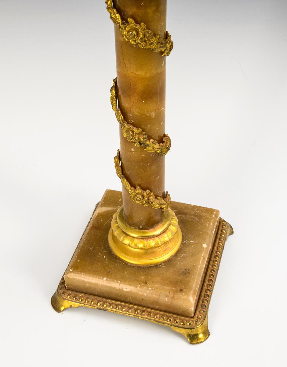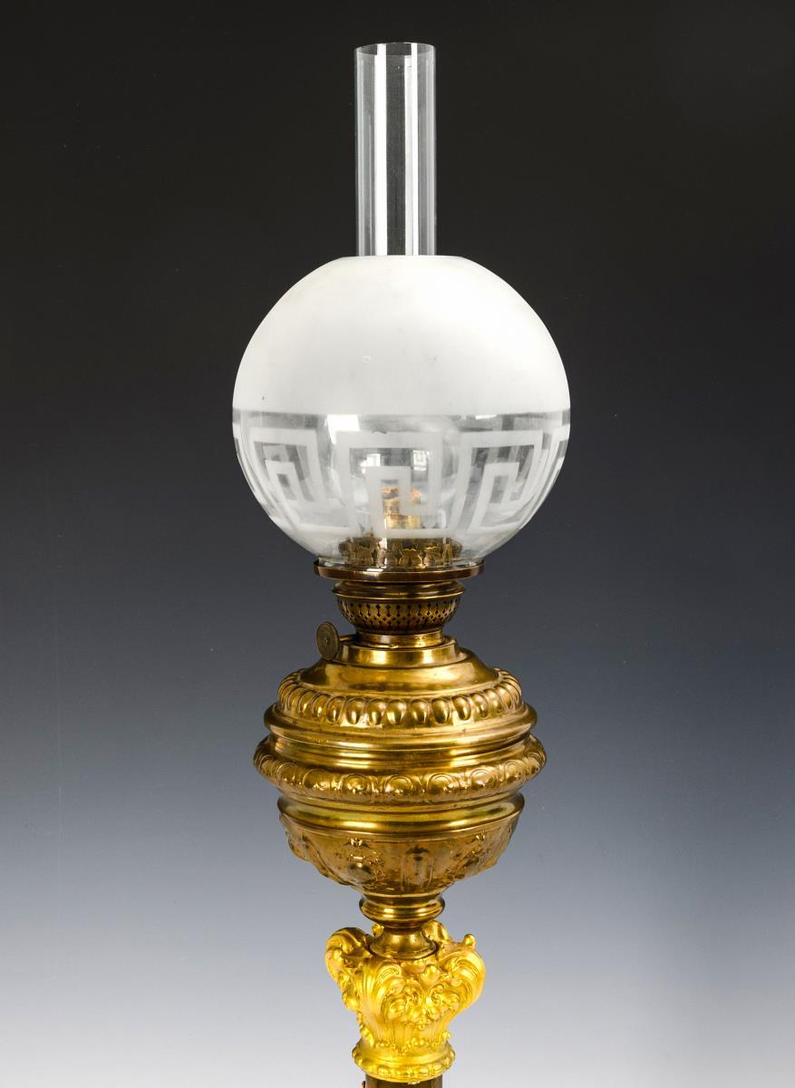 Auf dem beschwerten Quadratfuß stehende Marmorsäule mit umlaufender Spiralgirlande sowie bronziertes Kapitell. Reliefiertes Tankgehäuse, Runddocht-Brenner mit Kamin sowie Kugelglasschirm mit Mäandermotiv. Marmor leicht bestoßen, minimale Chips am Glas und geringer Ausbruch am Schirmstand.