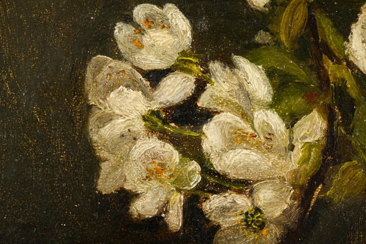 Zweig mit weißen Blüten vor dunklem Hintergrund.
