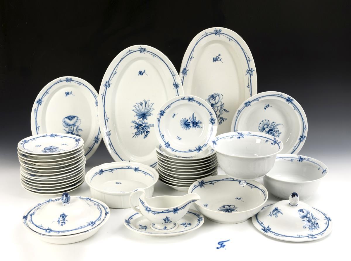 36 + 2 Teile. 14 Speiseteller (Ø 23 cm), 12 Suppenteller (Ø 23,2 cm), 3 Ovalplatten (L 37 bis 56 cm), 2 Deckelschüsseln (Ø 32 und 27,5 cm), 1 Sauciere (L 26,5 cm), 2 runde Schüsseln (Ø 26 cm), 1 Schale (Ø 27,5 cm) und 1 Schüssel (Ø 27 cm). Dazu 2 Deckel. Gebrauchsspuren (keine Bestoßungen).