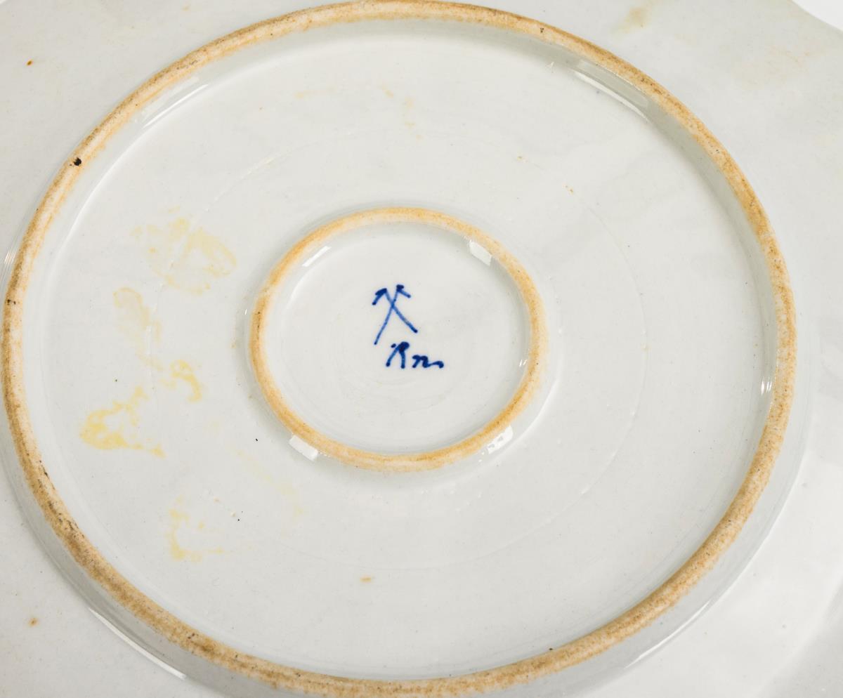 Unterglasurblaue Malerei, polychrome Aufglasurmalerei, Goldstaffage. Ø 23 cm.