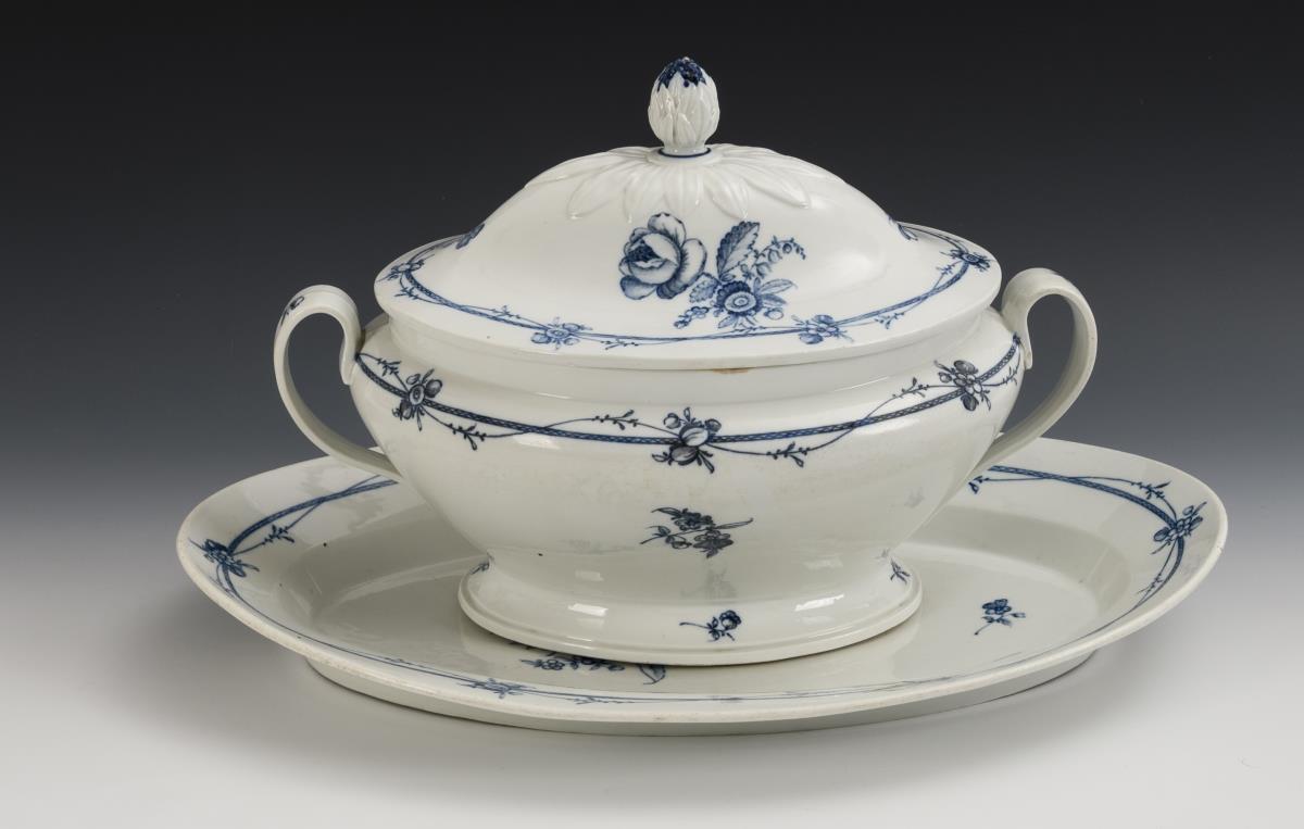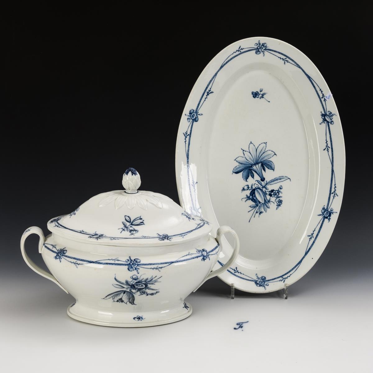 Unterglasurblaue Blumenmalerei. Ovale Terrine (L 40 cm), Ovalplatte (L 50,5 cm).