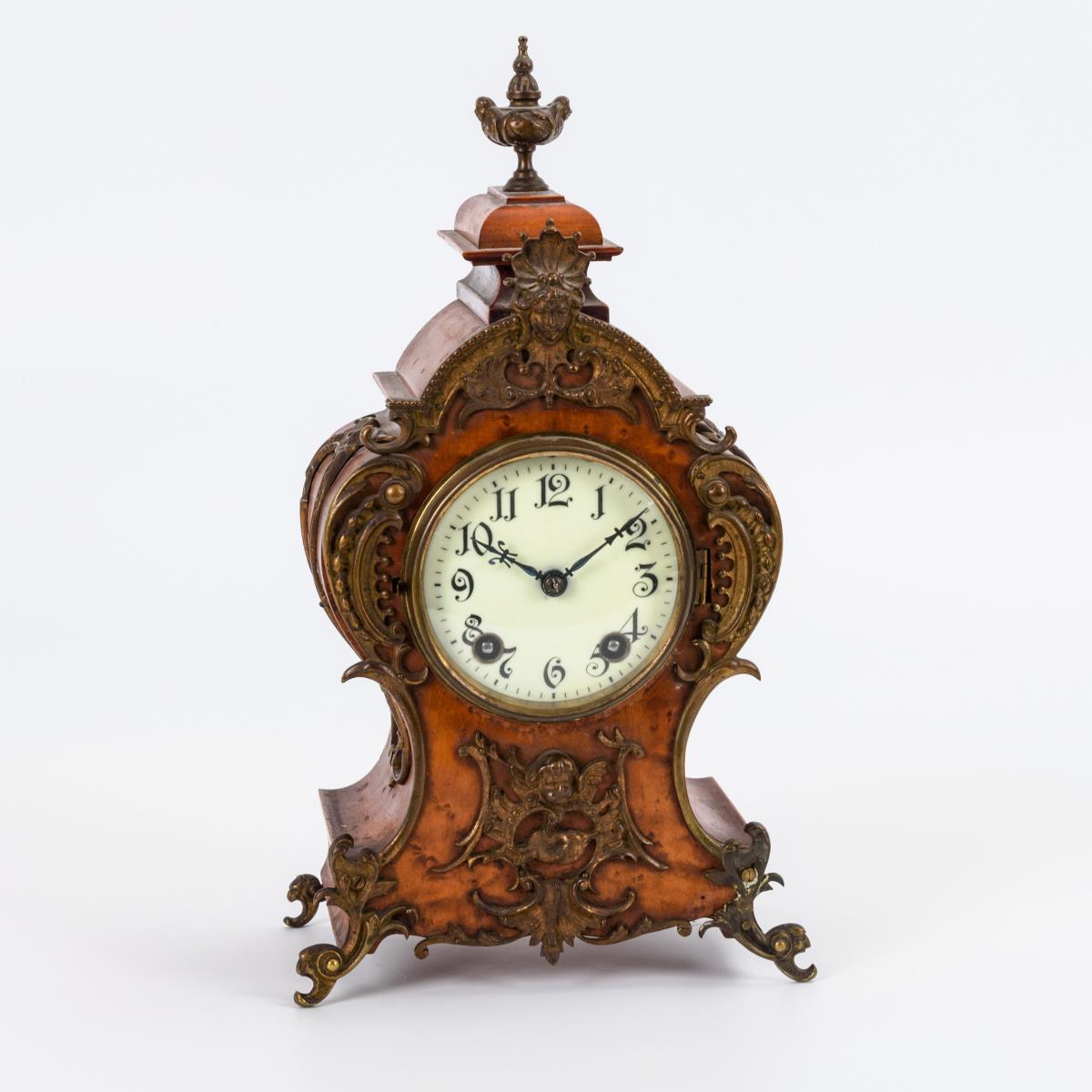 Rocailliertes Gehäuse mit bronzierten, historistischen Metallapplikationen. Gehwerk läuft nicht, Schlag funktionstüchtig. Leichte Alters- und Gebrauchsspuren.