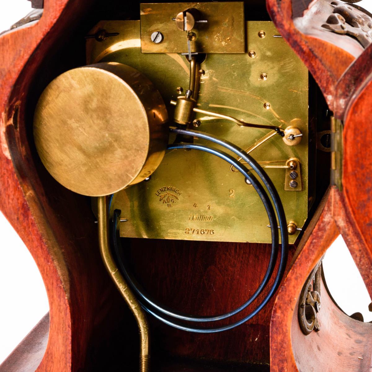 Werknummer: 1 Million 271676. Federwerk mit Halbstundenschlag auf Rundgong. Herstellerprägung Werk: Lenzkirch A.G.U. Elfenbeinfarbenes Emailzifferblatt mit arabischen Zahlen, Minutenkranz und Romaines-Zeigern.