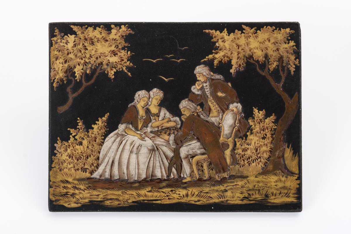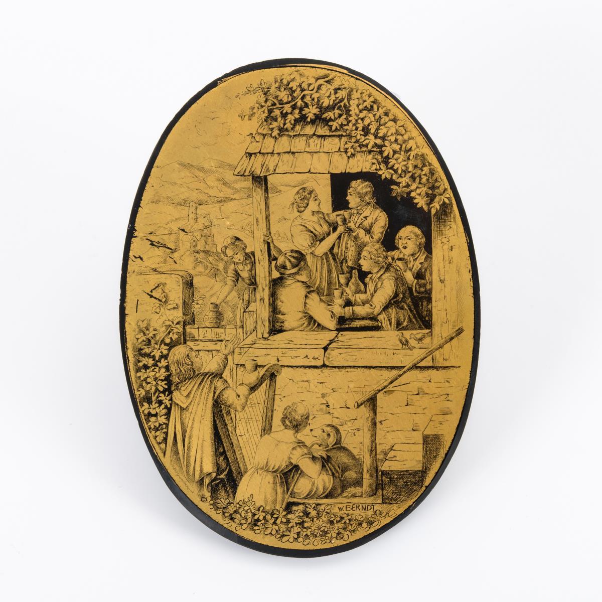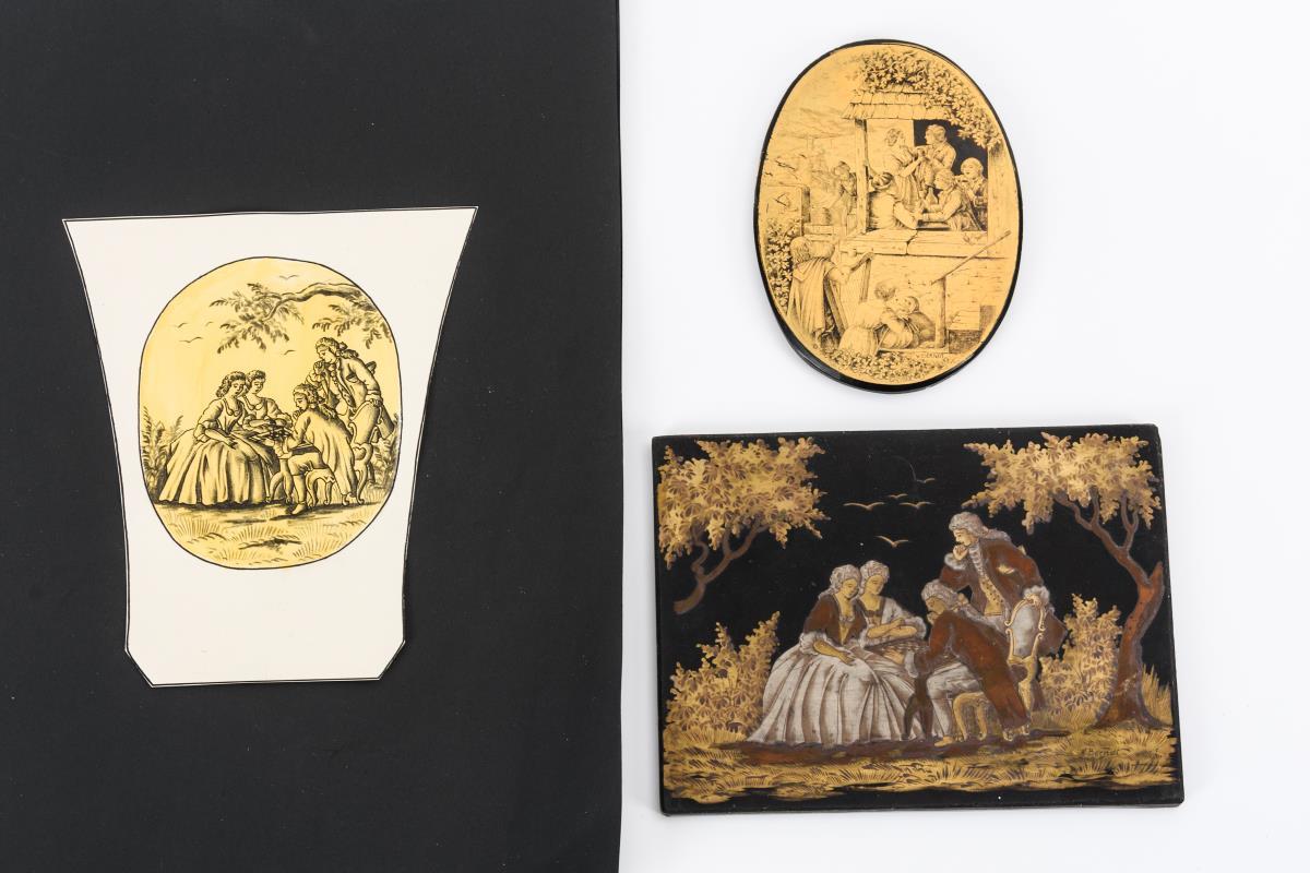 1 Ovalmedaillon mit der Darstellung einer Wirtshausszene. / 1x rechteckige Platte mit einer schachspielenden Rokokogesellschaft. / 2 Entwürfe für die Gestaltung eines Kraterbechers (davon 1x der Entwurf zur Darstellung auf der Rechteckplatte.