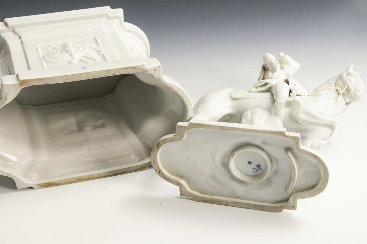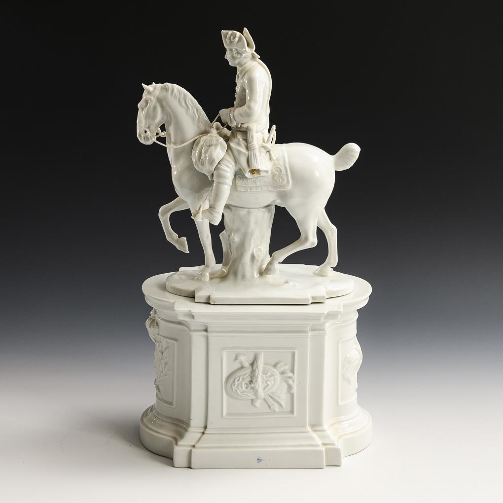 Plastik des Preußenkönigs Friedrich II. zu Pferd (H 29,5 cm). / Architektonischer Sockel mit Trophäenreliefs und dem Monogramm "FR" (= Fridericus Rex) (H 19 cm). Degenklinge fehlt, Zügel und Steigbügel aus weißer Schnur ergänzt, 1 Kandarenbaum geklebt, Chip an 1 Sockelkante.