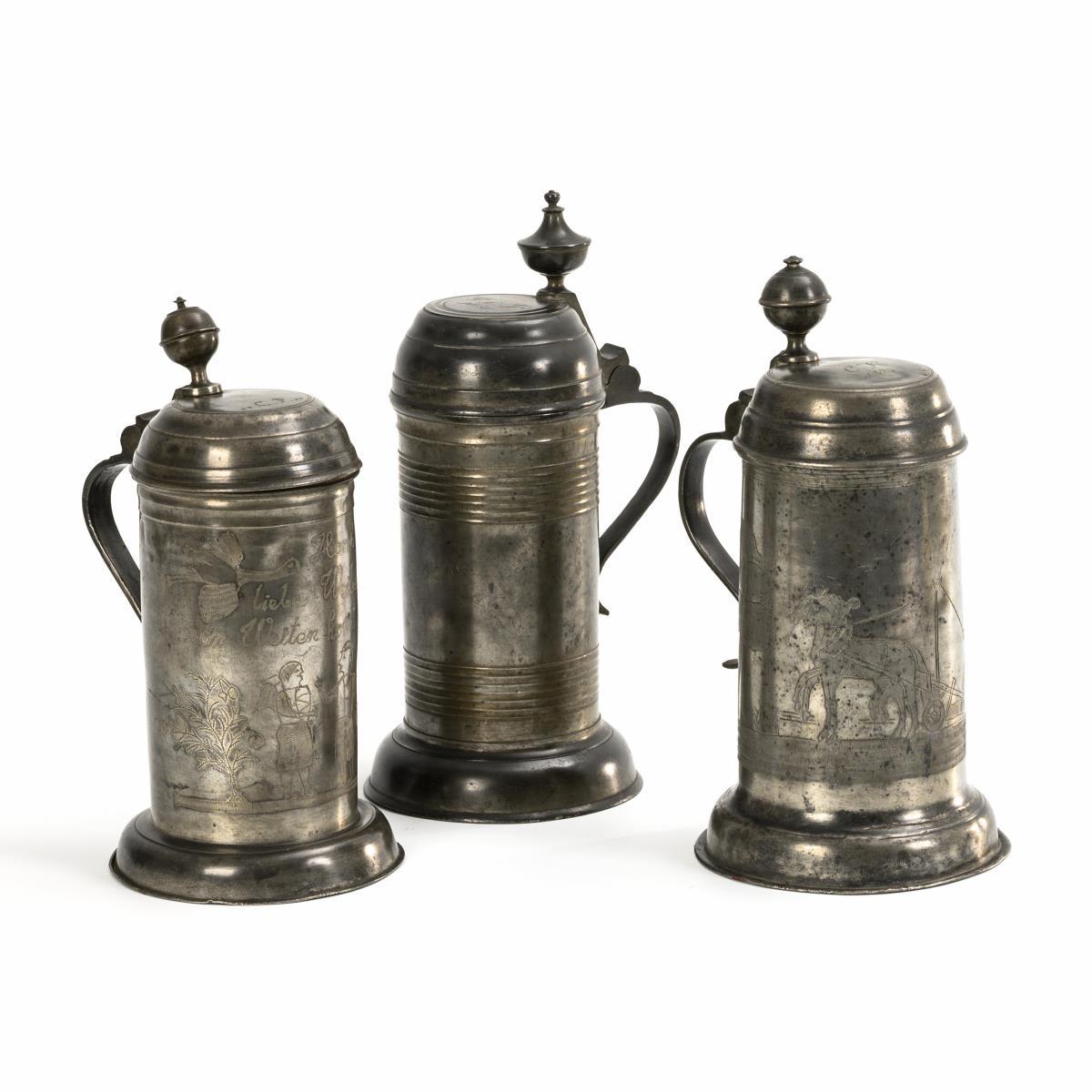 Wandungen mit Riffelbändern bzw. geflechelten Gravuren: Bauer beim Pflügen bzw. Paar mit Sinnspruch ""Horch liebes Weibel, horch, von Weiten kommt der Storch". Auf den Deckeln Monogramme mit Daten 1830, 1823 und 1888. Alters-/Gebrauchsspuren, 1x stärker.