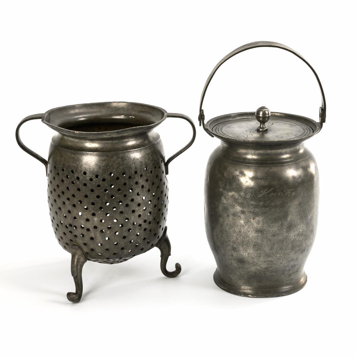 Siebtopf oder Zwiebeltopf auf 3 Beinen mit 2 Griffen sowie Gravur " Jh. Junghans a. Deckwitz 1845". / Ovoider Henkelkrug mit Gravur "Ein Bauer ohne Feld, ein Kaufmann ohne Geld, ein Ofen ohne Hitze, die sind der Welt nichts nütze", auf dem Passdeckel Reiter und Bauer. Je stärkere Alters-/Gebrauchsspuren, Siebboden teils gebrochen.
