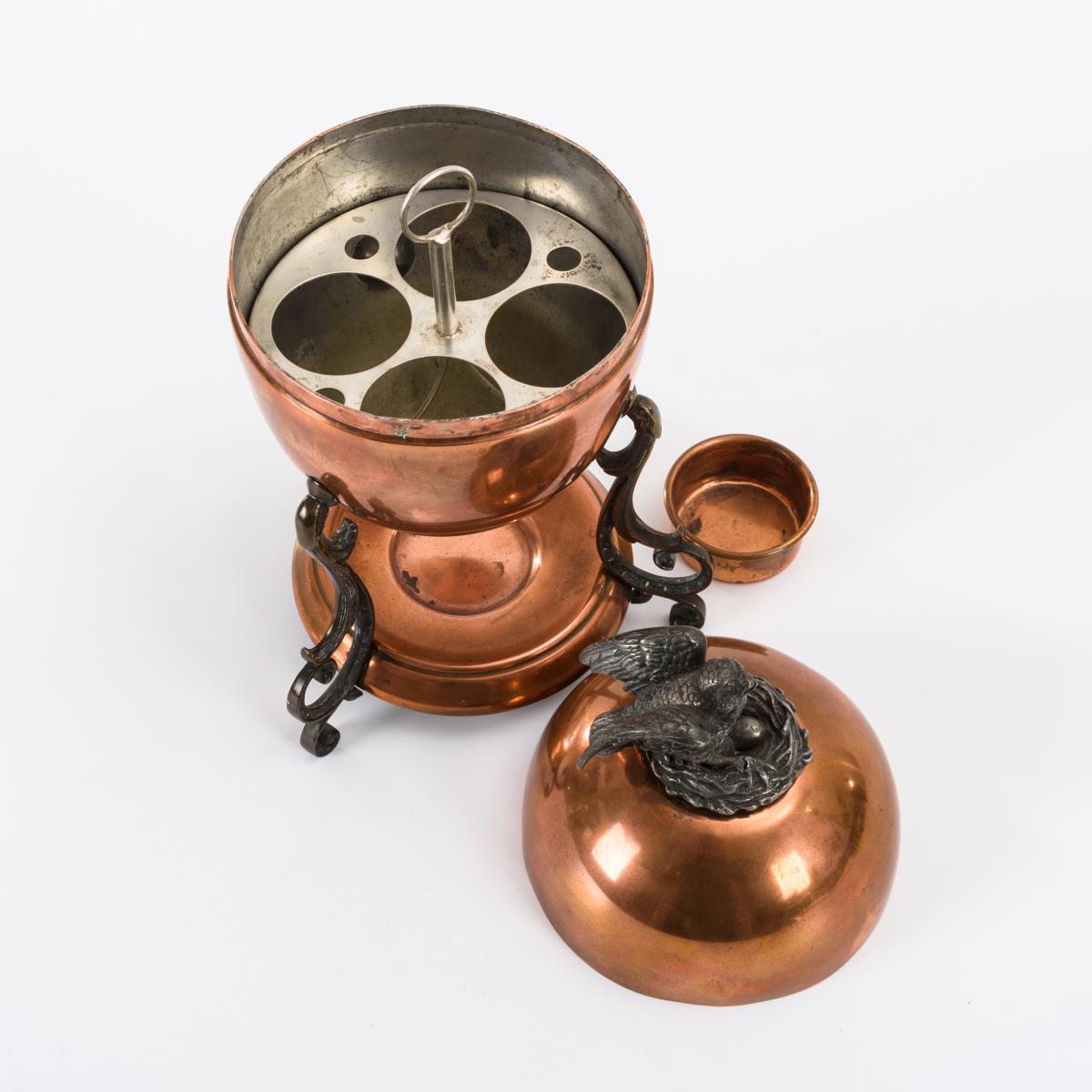Ovoider Eierkocher mit geschweiften Füßen und Vogel-Bekrönung sowie Brennerschale. Vogelbeine etwas gelockert, Einsatz für 4 Eier ergänzt, sonst kaum Alters-/ Gebrauchsspuren.