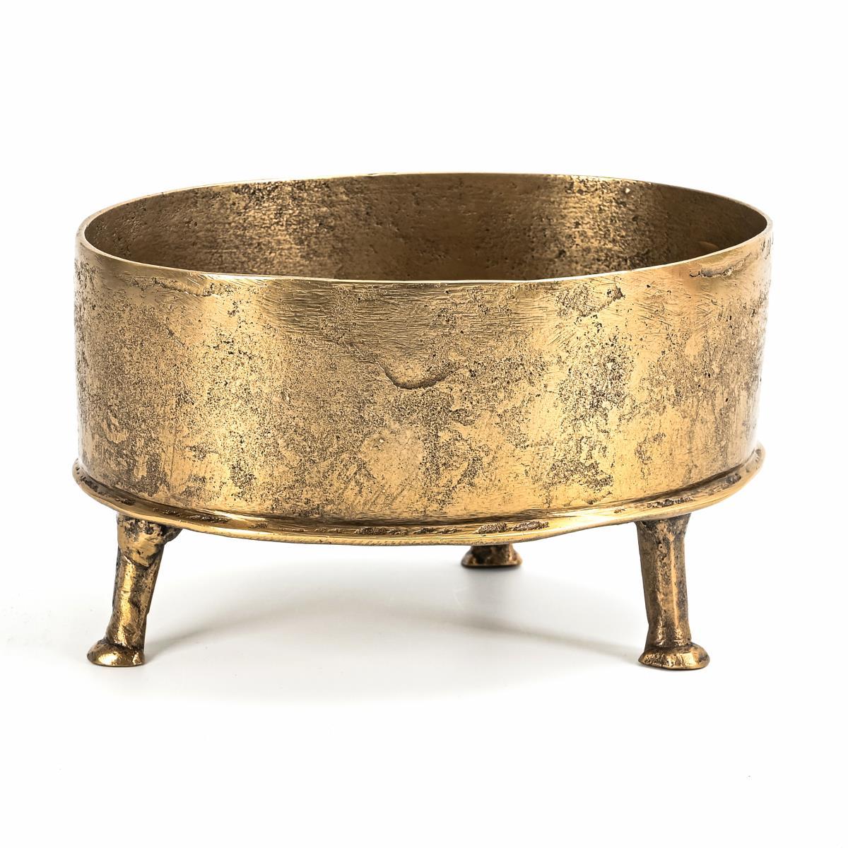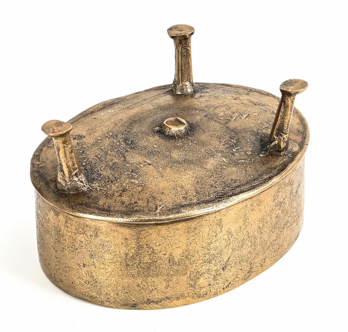 Als Jardiniere nutzbares Gefäß mit gerader Wandung und 3 mitgegossenen Beinen; unter dem Boden Anschnitt vom Guss. Wohl Nachguss von einem frühbarocken Kohleschapen. Feilspuren.
