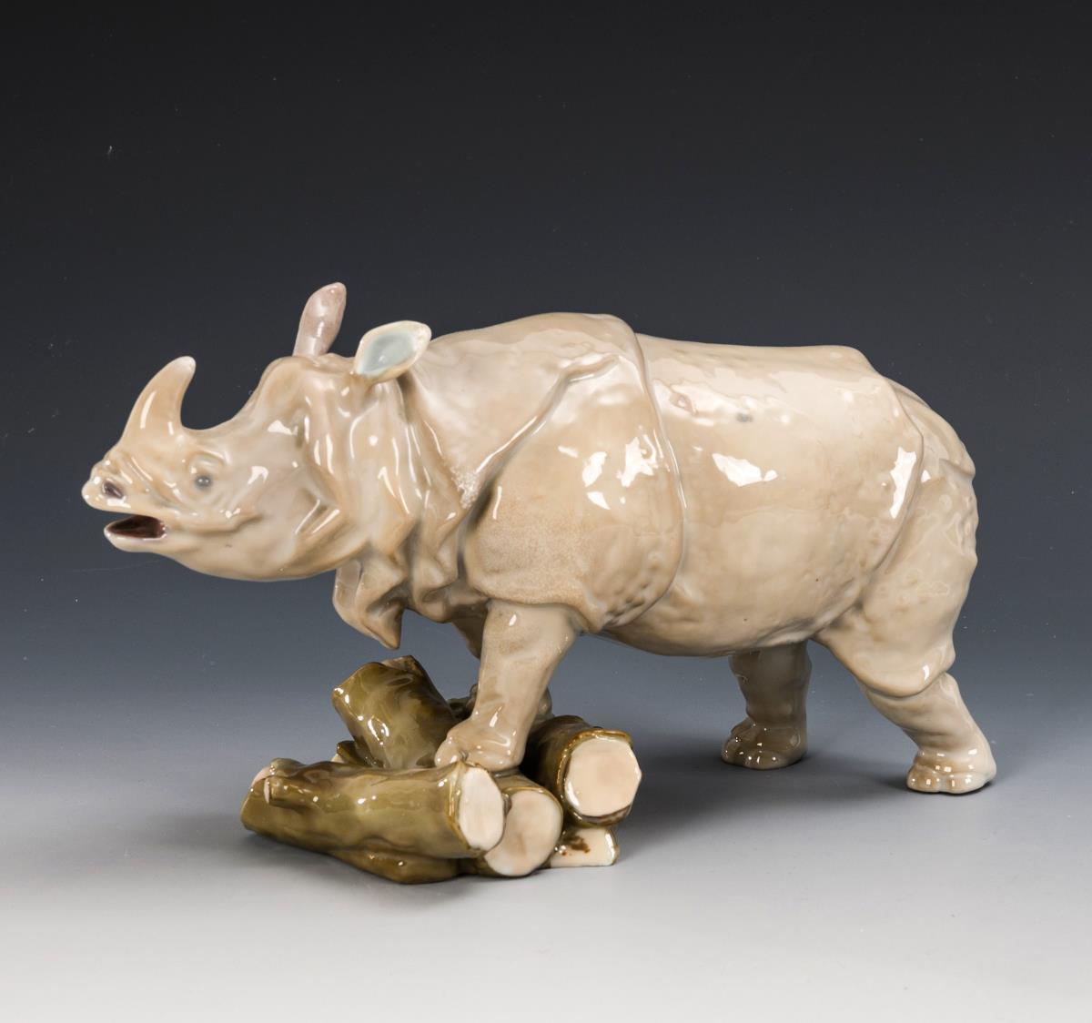 An einem Holzstapel stehendes Nashorn. Beide Ohren restauriert.
