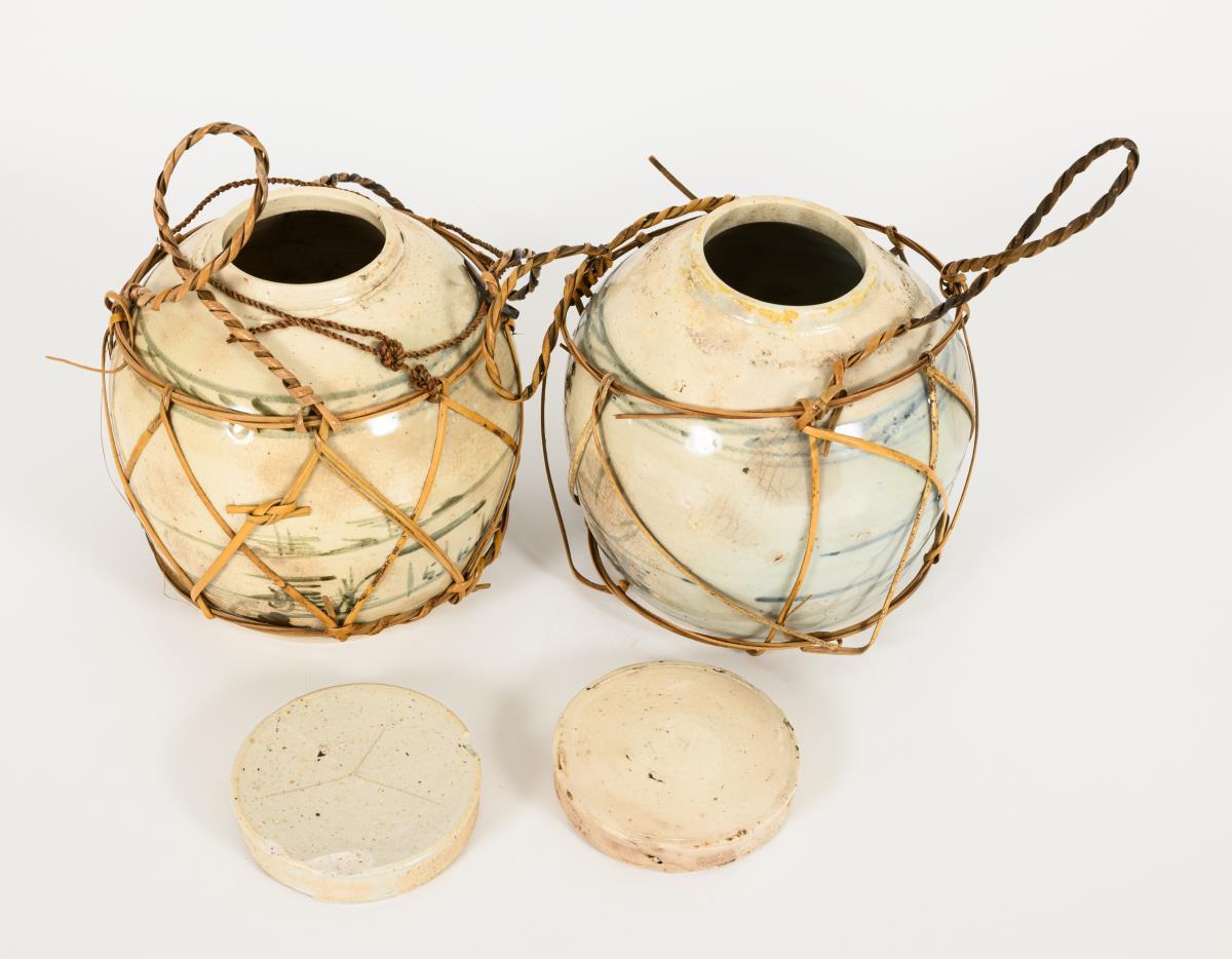 Deckelgefäße mit sehr stark stilisierter bzw. reduzierter Landschaftsdarstellung in Unterglasur-Blau. Oberfläche krakeliert bzw. mit Unregelmäßigkeiten durch die Produktion. Alte Chips an den Rändern, ein Deckel mit Haarriss.