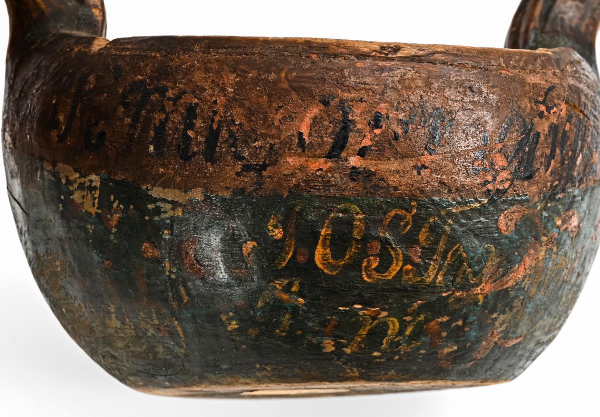 Aus einem Stück geschnitztes, halbkugelförmiges Gefäß mit 2 Handhaben. Ursprünglich wohl vollständig bemalt; außen neben Blumen Reste einer Beschriftung. Trockenrisse, kleinere Fehlstellen und Ausbesserungen, stark berieben.