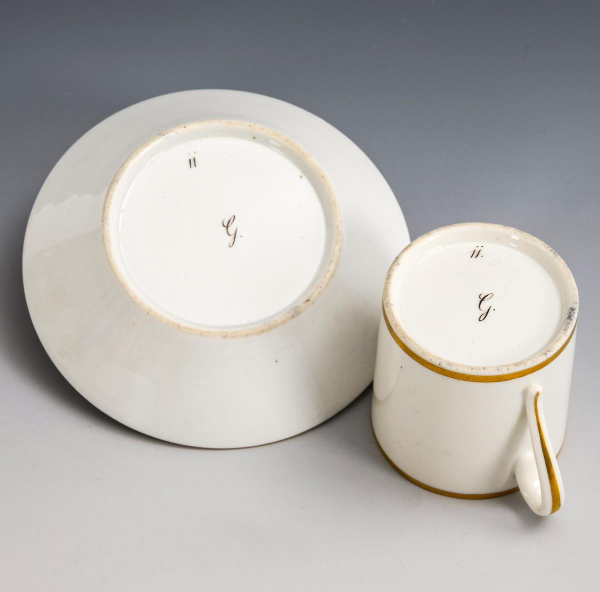 Polychrom bemalt, goldstaffiert. Tasse (H 6,5 cm), originale Untertasse (Ø 13 cm).