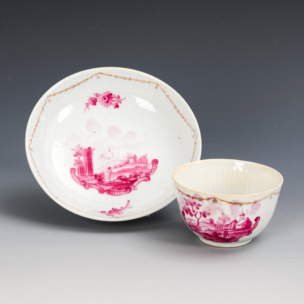 Purpurfarbene Landschaftsmalerei, Goldstaffage. Tasse (H 4,5 cm), originale Untertasse (Ø 13 cm).