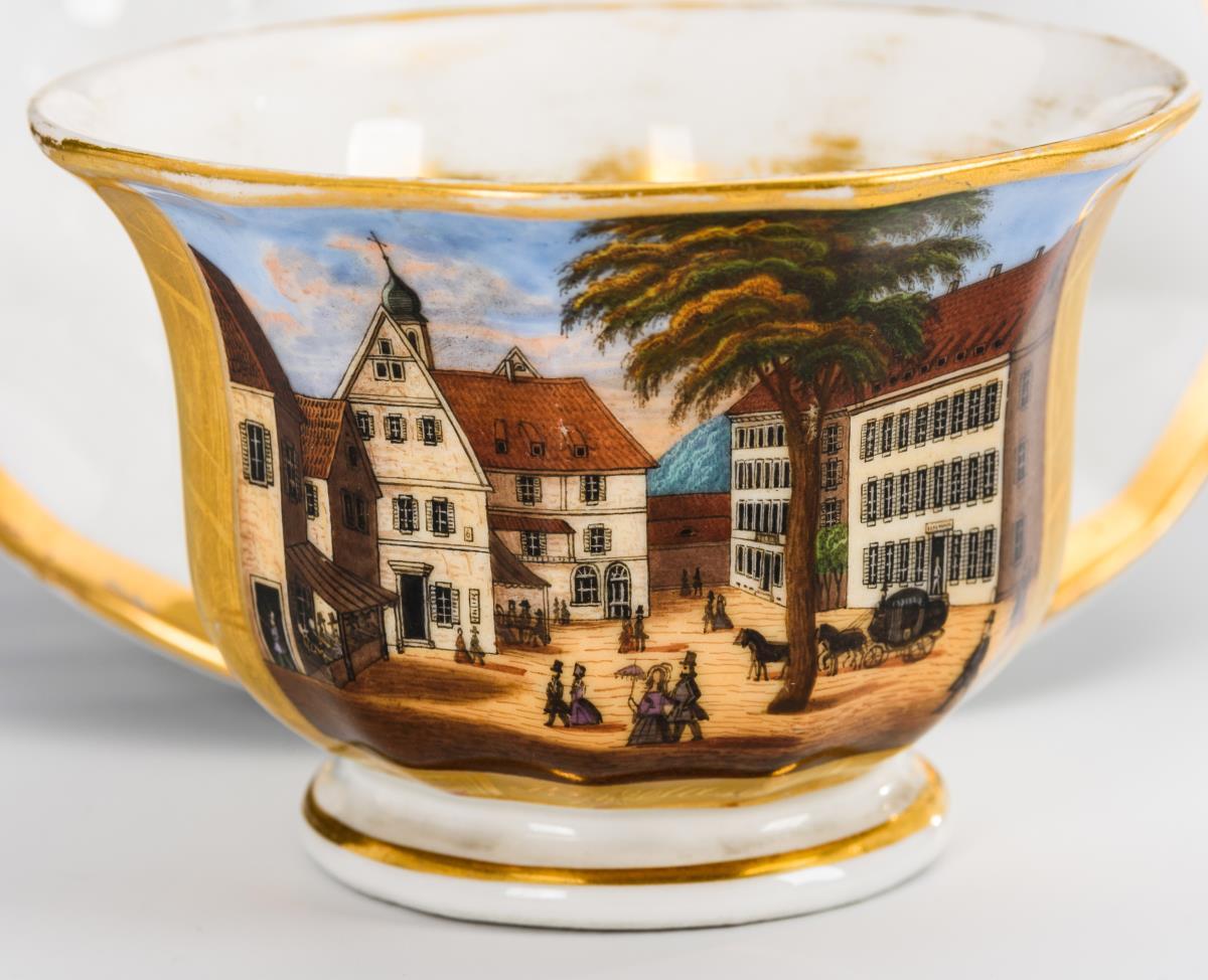 Schauseitig eine Rechteckkartusche mit der bezeichneten Ansicht von Bad Rippoldsau-Schwapbach im Schwarzwald. Partieller Goldabrieb, geklebter Chip am Tassenrand.