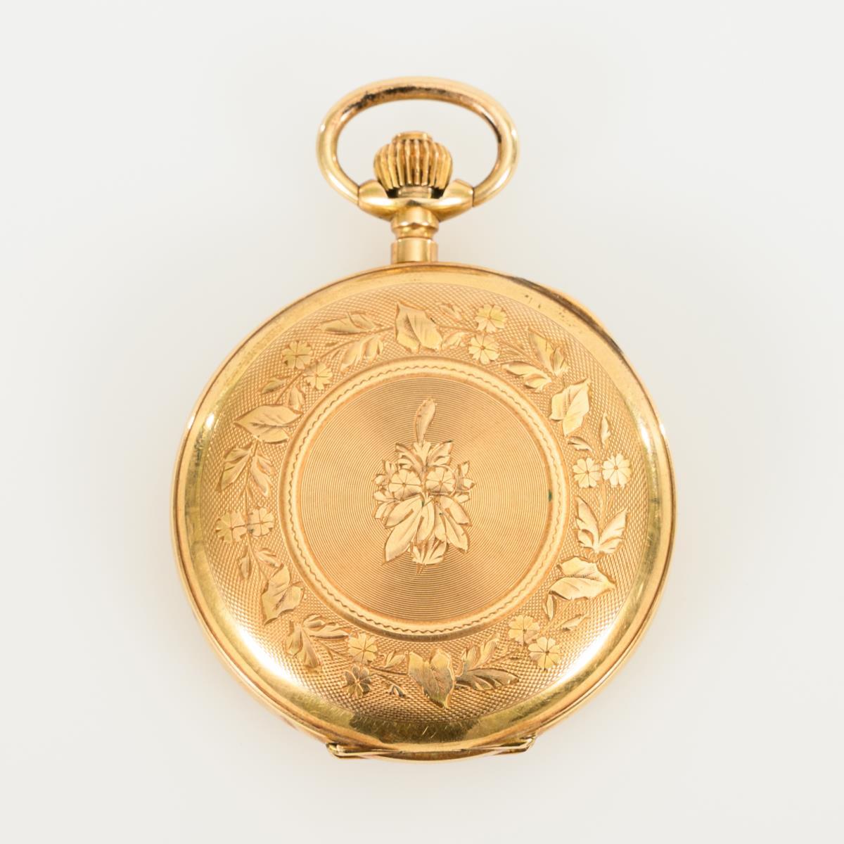Ziseliertes Sprungdeckelgehäuse mit Blumen- und Blattkränzen sowie einer leeren Wappenreserve. Alters- und Gebrauchsspuren, partiell gedellt, getöntes Kunststoffglas.
