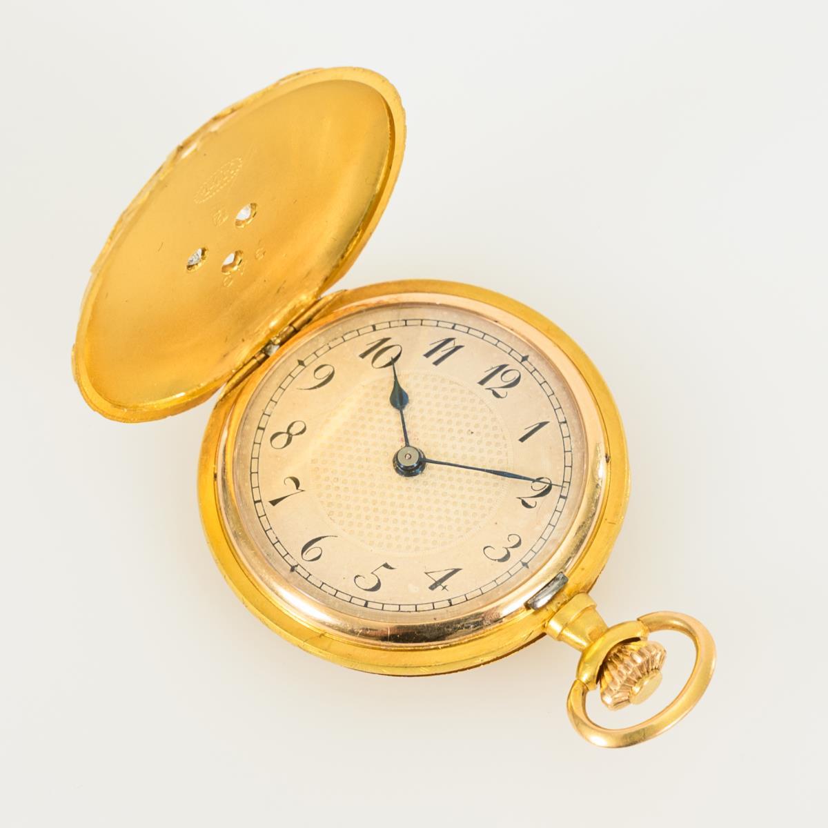 Schuppengraviertes Gehäuse mit floral reliefierter Front und 3 Altschliffdiamanten. Leichte Alters- und Gebrauchsspuren.
