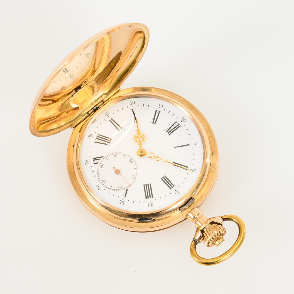Guillochiertes Sprungdeckelgehäuse. Minimale Alters- und Gebrauchsspuren, am Rand leicht gedellt, innen partiell kleine Kratzer, kleiner Ausbruch am Ziffernblatt bei der 10.
