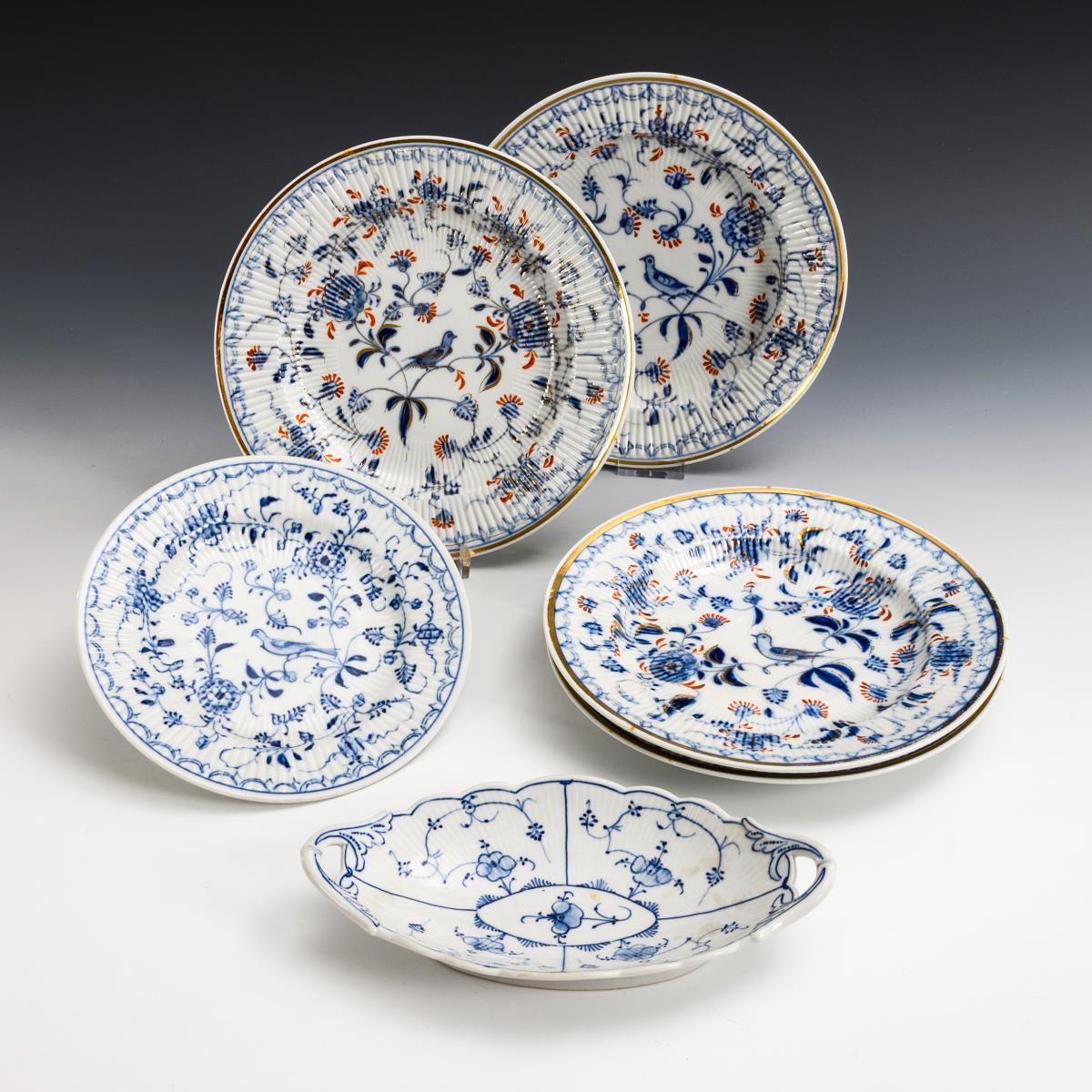 Form "Gebrochener Stab". 4 + 1 Vogelmuster-Teller (Ø 4x 24 cm und 1x 20 cm) und 1 Ovalschale mit ausgetuschter Strohblumenmalerei (L 23,5 cm). 1 Speiseteller mit unterseitiger Randbestoßung.
