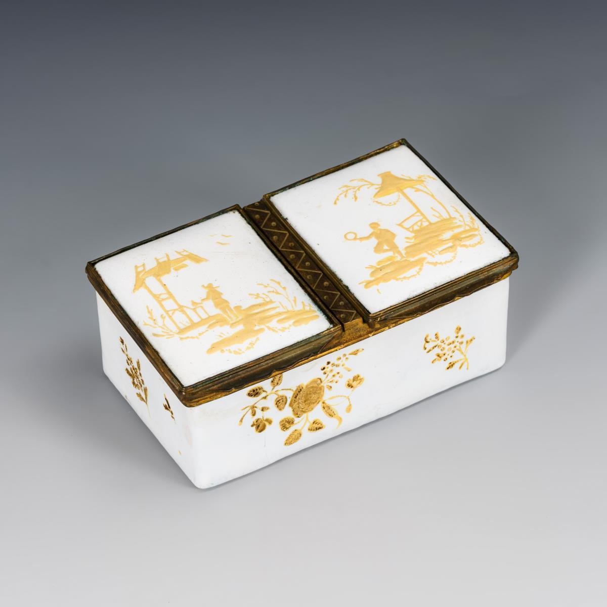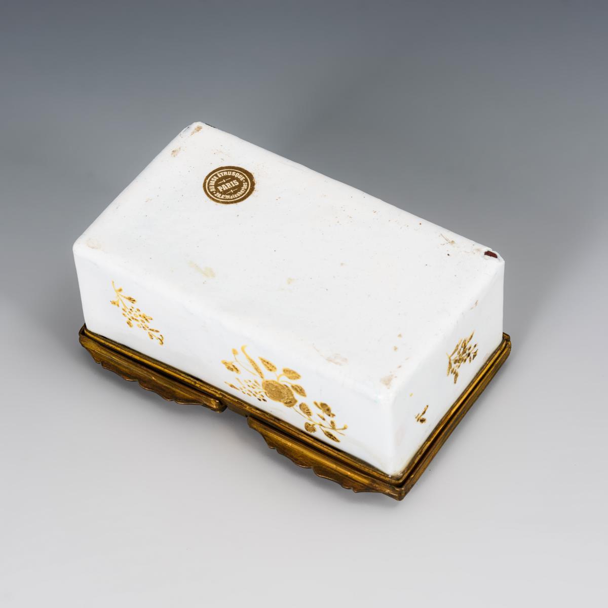 Weißes Email auf Kupfer, Email de Saxe, Messingmontierung, auf dem Boden Etikett "Au Vase Étrusque, Paris". 4 x 10 x 6 cm.